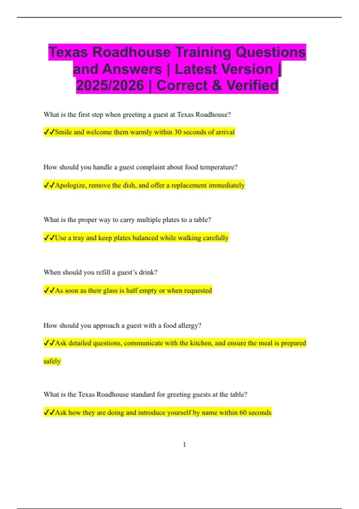 Texas Roadhouse Training Questions and Answers | Latest Version | 2025/2026 | Correct & Verified What is the first step when greeting a guest at Texas Roadhouse? Smile and welcome them warmly within 30 seconds of arrival How should you handle a guest complaint about food temperature? Apologize, remove the dish, and offer a replacement immediately What is the proper way to carry multiple plates to a table? Use a tray and keep plates balanced while walking carefully When should you refill a guest’s drink? As soon as their glass is half empty or when requested How should you approach a guest with a food allergy? Ask detailed questions, communicate with the kitchen, and ensure the meal is prepared safely What is the Texas Roadhouse standard for greeting guests at the table? Ask how they are doing and introduce yourself by name within 60 seconds 2 How should you handle a guest who is unhappy with their steak doneness? Apologize and offer to cook a new steak to their preferred temperature What is the procedure for taking an order from a large party? Start with drinks, then appetizers, and write down each order clearly while confirming details How should you handle a guest who is asking for menu recommendations? Provide personal favorites and explain popular items, highlighting specials What is the Texas Roadhouse policy for upselling? Suggest add-ons like appetizers, sides, or desserts politely without being pushy How should you handle a spill at a guest’s table? Apologize, clean it immediately, and offer assistance if needed What is the proper way to present the check to a guest? Place it in the guest’s view politely and thank them for dining How often should you check on guests after serving their meals? Within the first two bites and periodically thereafter What is the correct response if a guest asks for extra butter for rolls? 3 Bring it promptly and refill as needed without being asked again How should you handle a guest asking for a custom steak modification? Confirm the modification with the kitchen and repeat it back to the guest What is the proper way to bus a table after guests have finished dining? Clear plates quietly, refill drinks if needed, and reset the table for the next guests How should you respond if a guest says their food tastes salty or under-seasoned? Apologize and offer a replacement or adjustment immediately What is the Texas Roadhouse standard for responding to a table request? Respond within 2 minutes of the guest asking for assistance How should you greet a guest who is celebrating a birthday or special occasion? Acknowledge the celebration with enthusiasm and offer the restaurant’s complimentary options What is the correct way to handle multiple guest orders arriving at the same time from the kitchen? Check each plate for accuracy, deliver promptly,