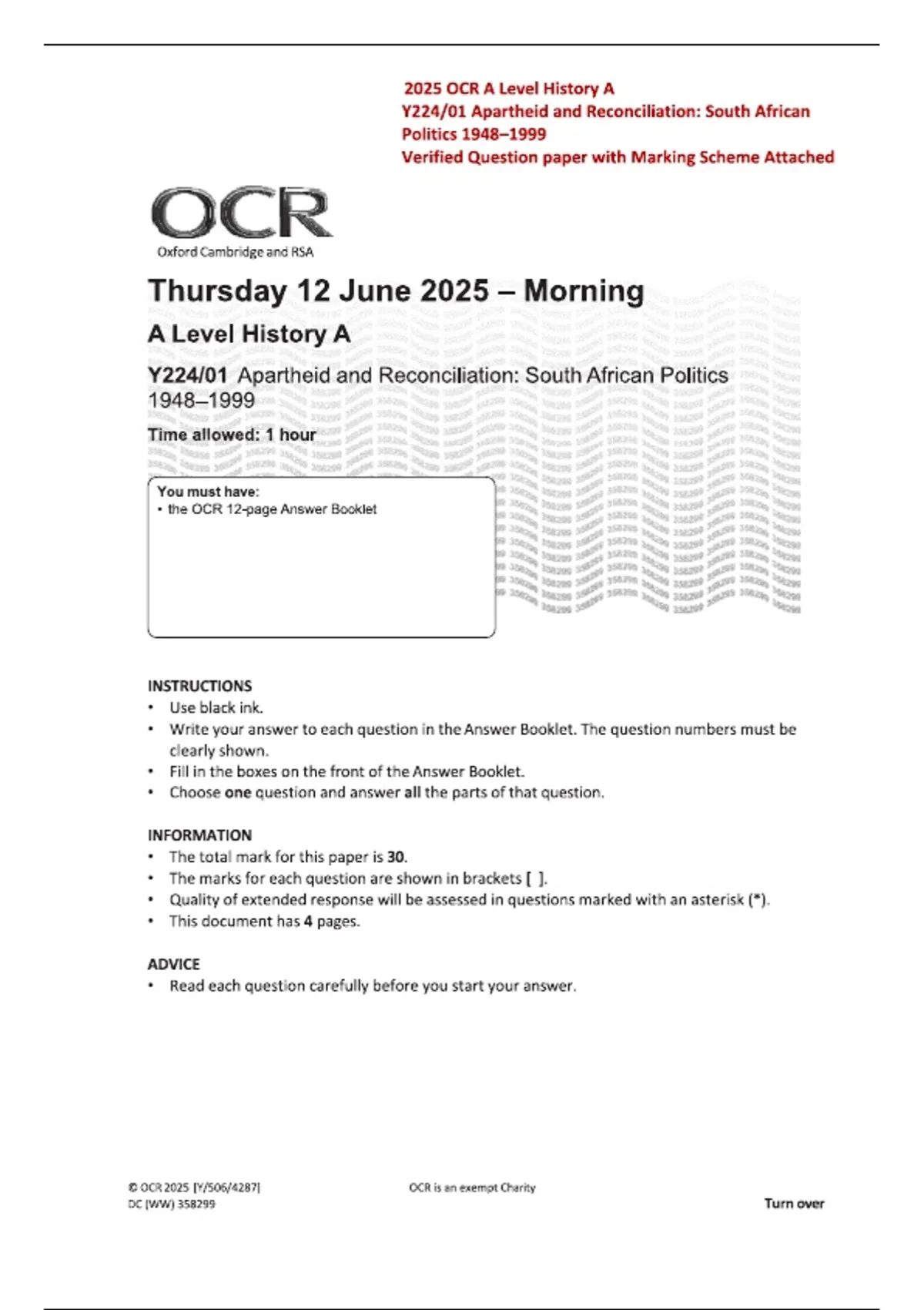 Prepare for OCR A Level 2025 History A with this official Y224/01 question paper on Apartheid and Reconciliation: South African Politics 1948–1999. Includes detailed marking scheme, fully worked answers, comprehensive topic coverage, and strategies for achieving top marks. Ideal for structured revision, exam preparation, and academic excellence.