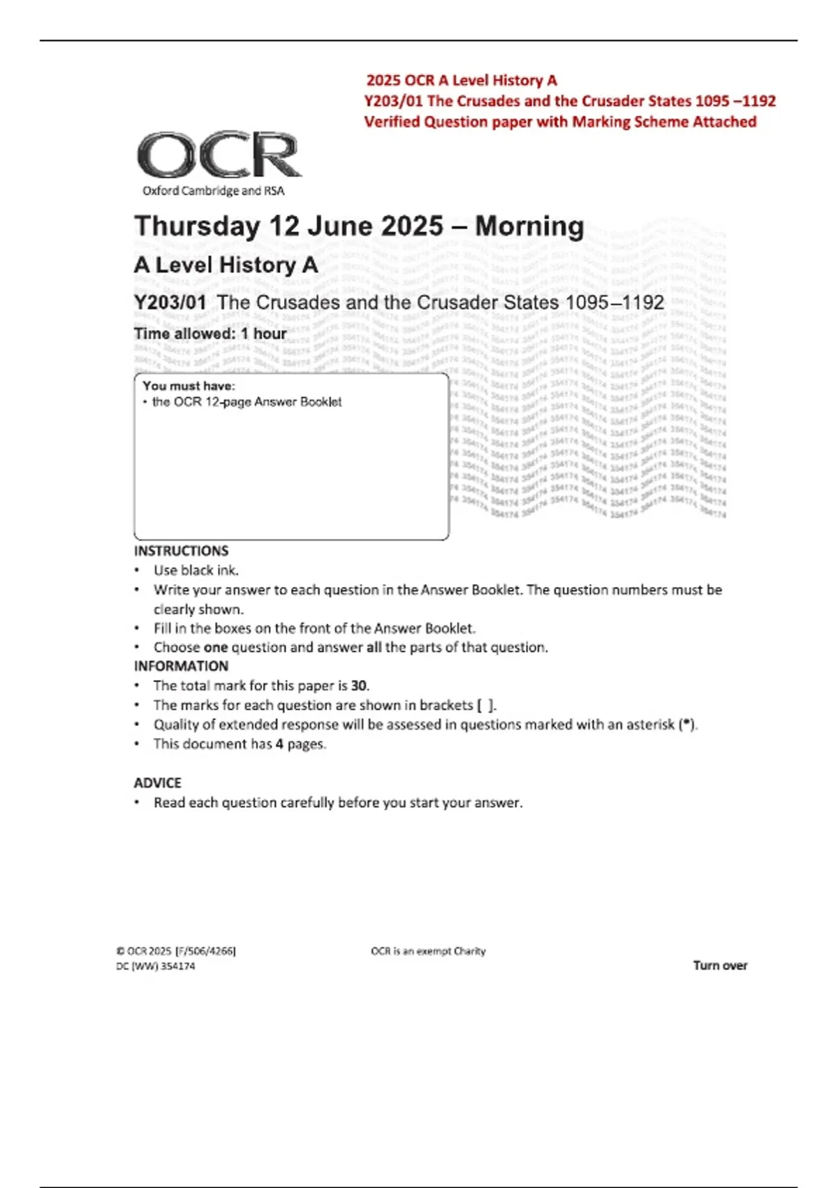 OCR A Level 2025 History A Y203/01 The Crusades and the Crusader States 1095–1192 Question Paper | Official with Marking Scheme & Fully Worked Answers