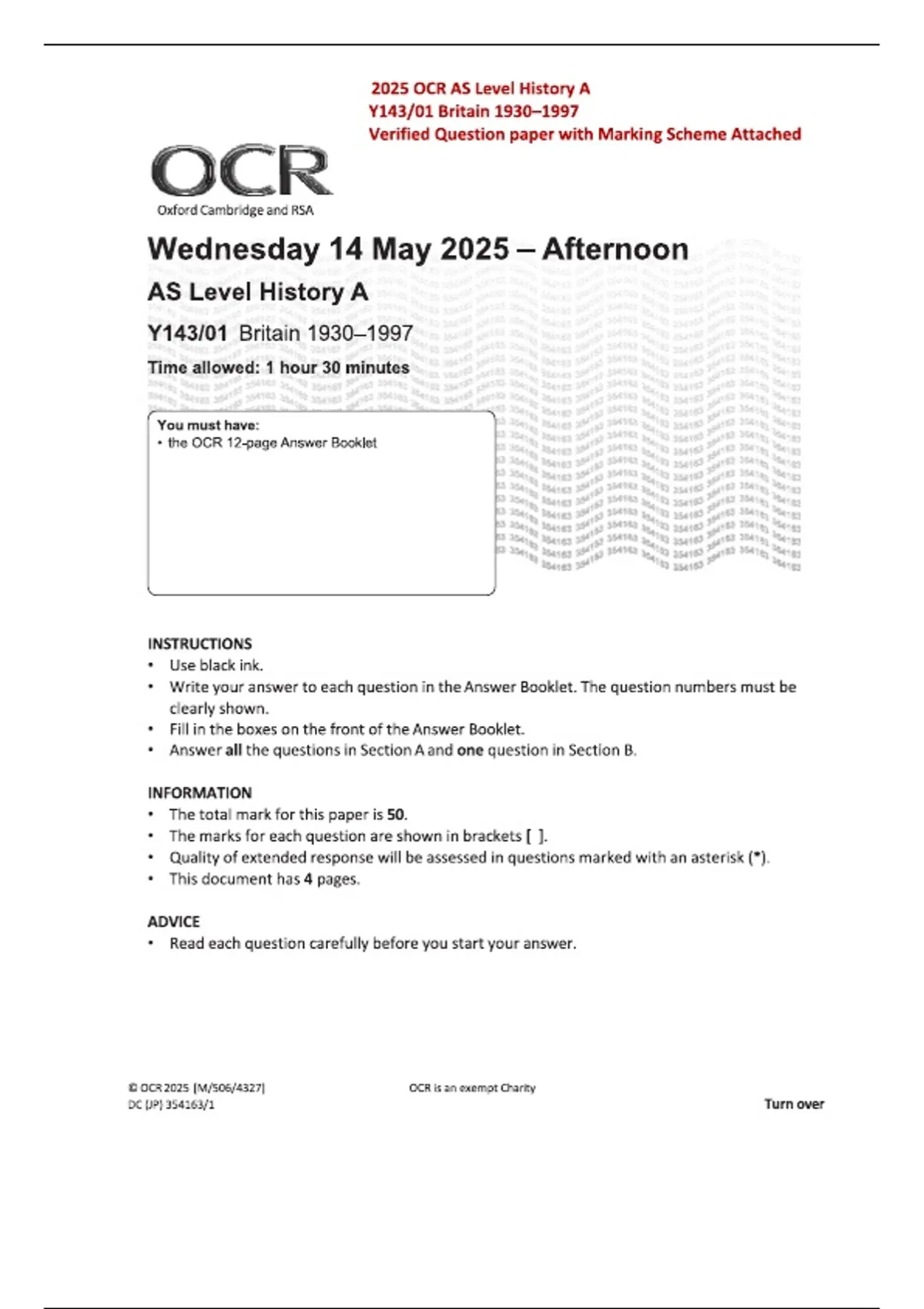 Prepare for OCR AS Level 2025 History A with this official Y143/01 question paper on Britain 1930–1997. Includes detailed marking scheme, fully worked answers, comprehensive topic coverage, and strategies for achieving top marks. Ideal for exam preparation, structured revision, and academic excellence.