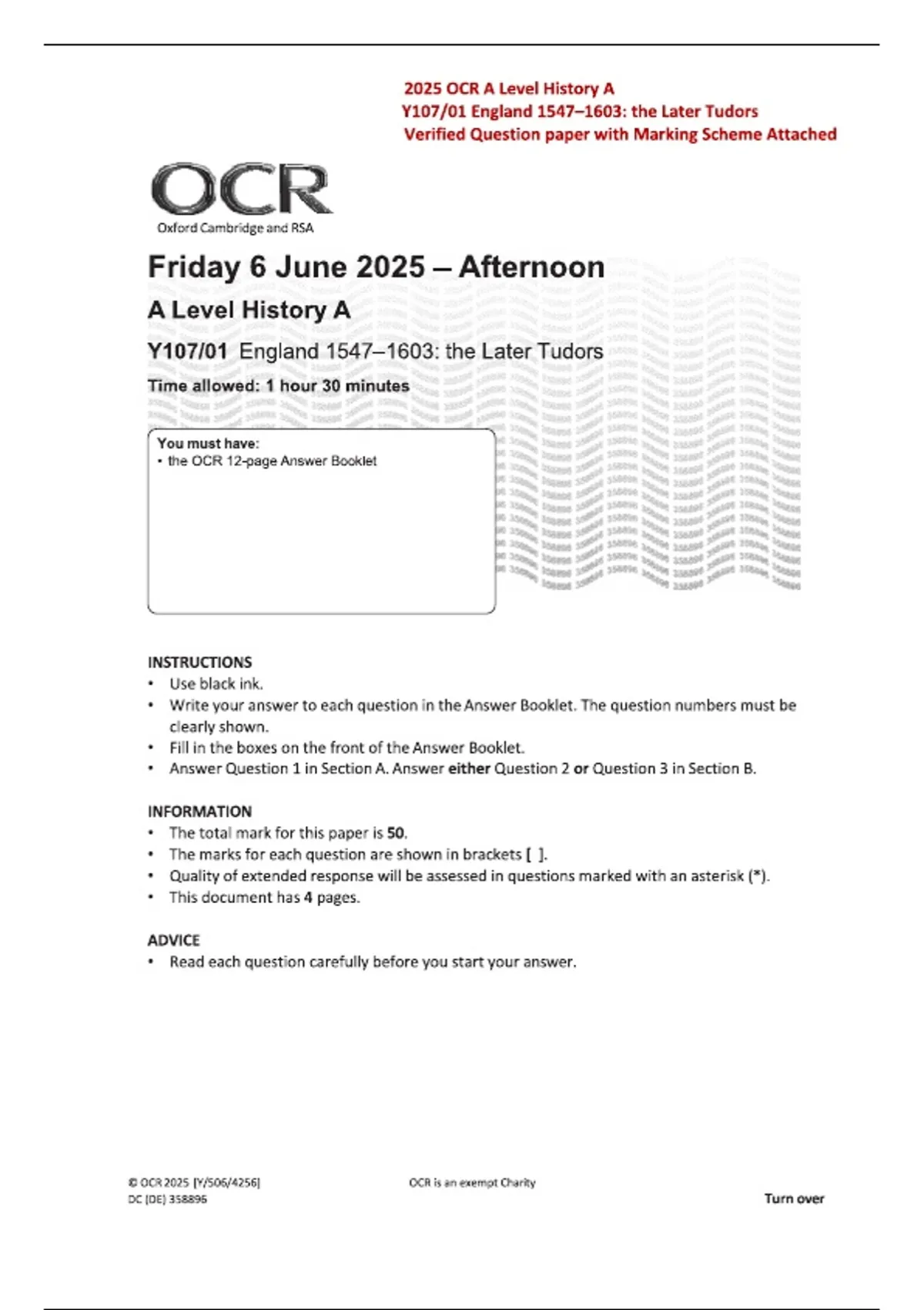 OCR A Level 2025 History A Y107/01 England 1547–1603: The Later Tudors Question Paper | Official with Marking Scheme & Fully Worked Answers