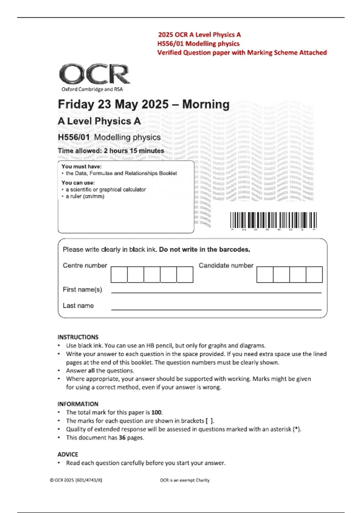OCR 2025 A Level Physics A H556/01 Modelling Physics Question Paper with Official Examiner Mark Scheme