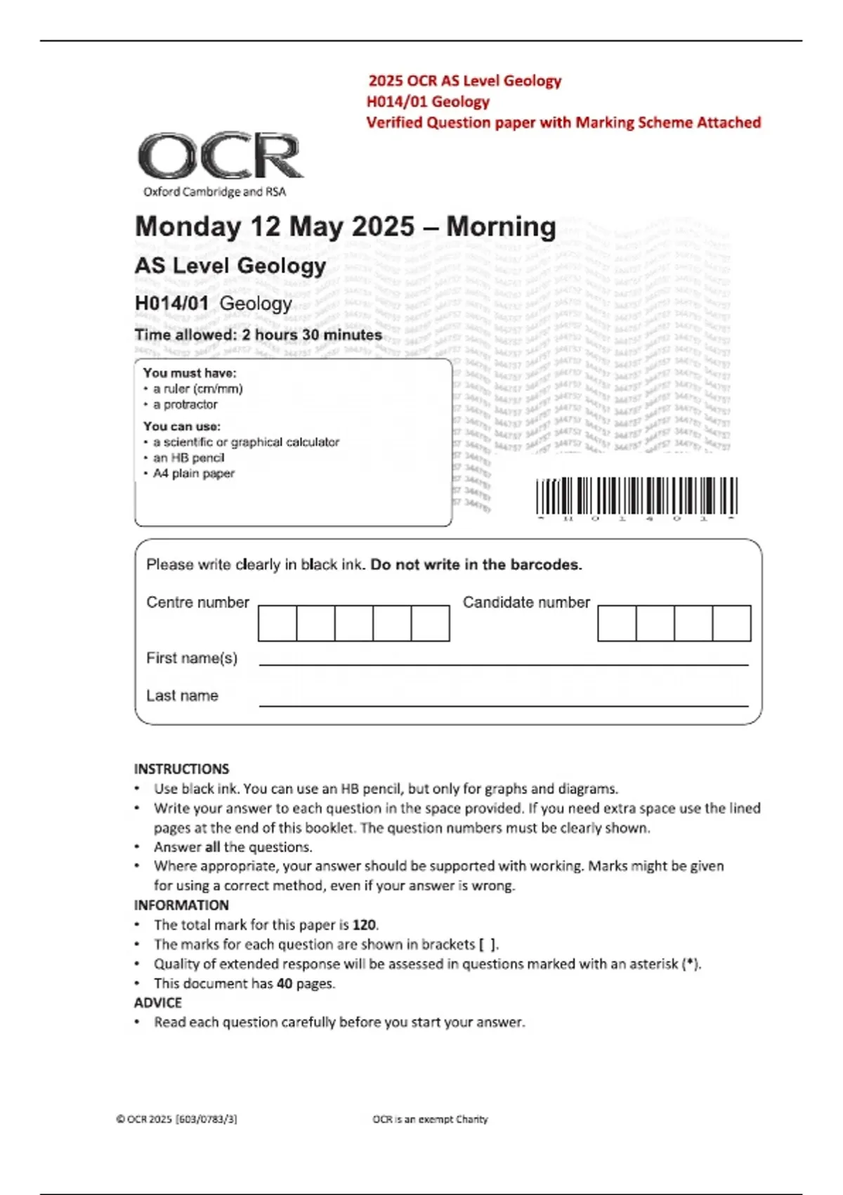 This resource provides the OCR 2025 AS Level Geology H014/01 Geology question paper, accompanied by the official examiner mark scheme. It assesses candidates’ understanding of geological principles, processes, and case studies, in line with OCR AS Level Geology assessment objectives. This material supports structured revision and effective examination preparation.