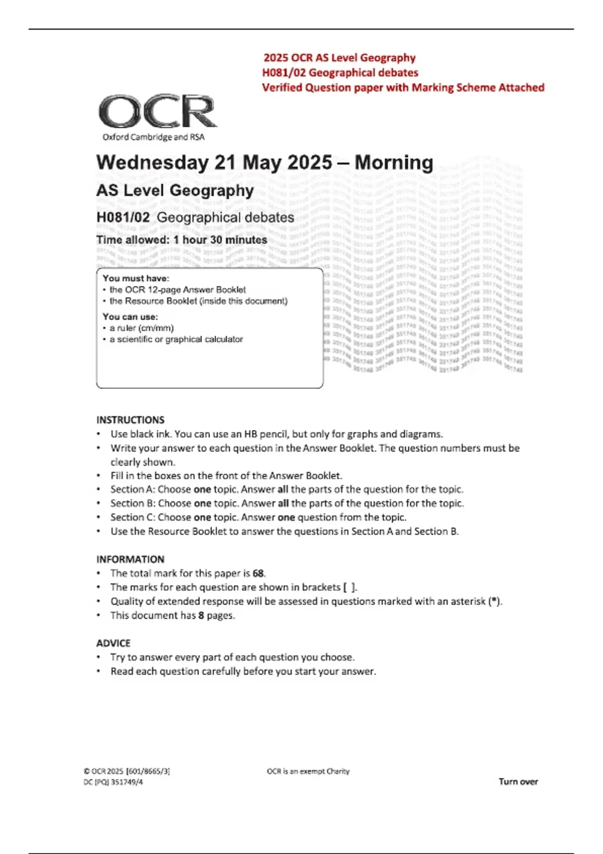 This resource provides the OCR 2025 AS Level Geography H081/02 Geographical Debates question paper, accompanied by the official examiner mark scheme. It assesses candidates’ understanding of key geographical debates, including environmental, social, and economic perspectives, in line with OCR AS Level Geography assessment objectives. This material supports structured revision and effective examination preparation.