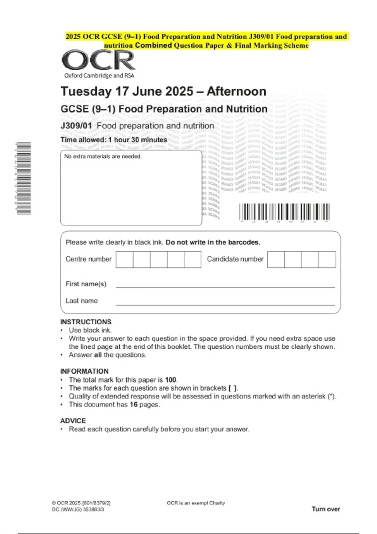 2025 OCR GCSE (9–1) Food Preparation and Nutrition J309/01 Food preparation and nutrition Combined Question paper with approved marking scheme