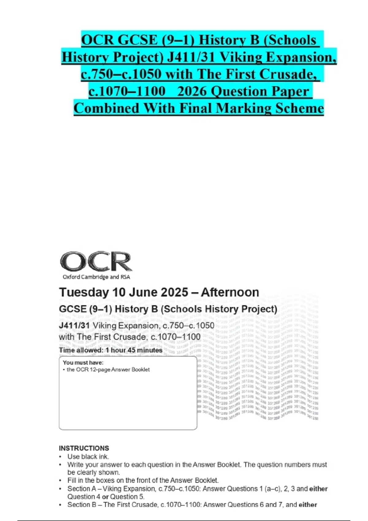 OCR GCSE (9–1) History B (Schools History Project) J411/31 Viking Expansion, c.750–c.1050 with The First Crusade, c.1070– Question Paper Combined With Final Marking Scheme