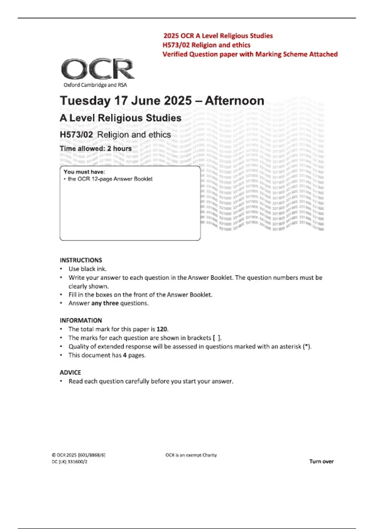 OCR 2025 A Level Religious Studies H573/02 Religion & Ethics Exam OCR Religious Studies Verified Question Paper Religion and Ethics A Level Exam Prep Moral Philosophies and Ethical Dilemmas Study Applied Ethics Exam Questions OCR RS Marking Scheme 2025 A Level Religious Studies Revision Exam Practice Religion & Ethics Verified Answers Religious Studies H573/02Question Paper with Marking Scheme