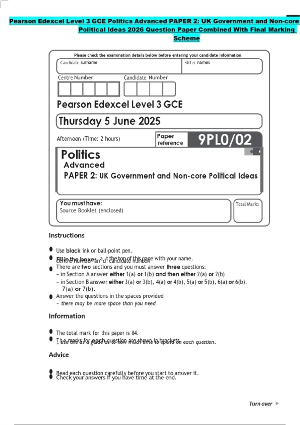 Pearson Edexcel Level 3 GCE Politics Advanced PAPER 2: UK Government and Non-core Political Ideas 2026 Question Paper Combined With Final Marking Scheme