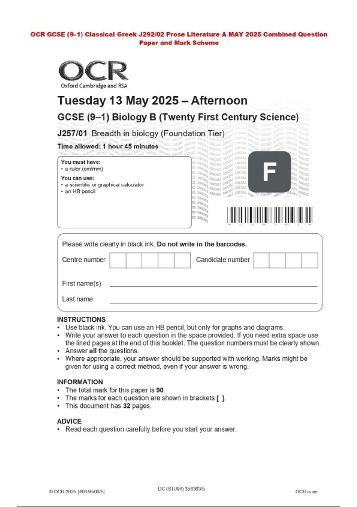 OCR GCSE (9–1) Classical Greek J292/02 Prose Literature A MAY 2025 Combined Question Paper and Mark Scheme