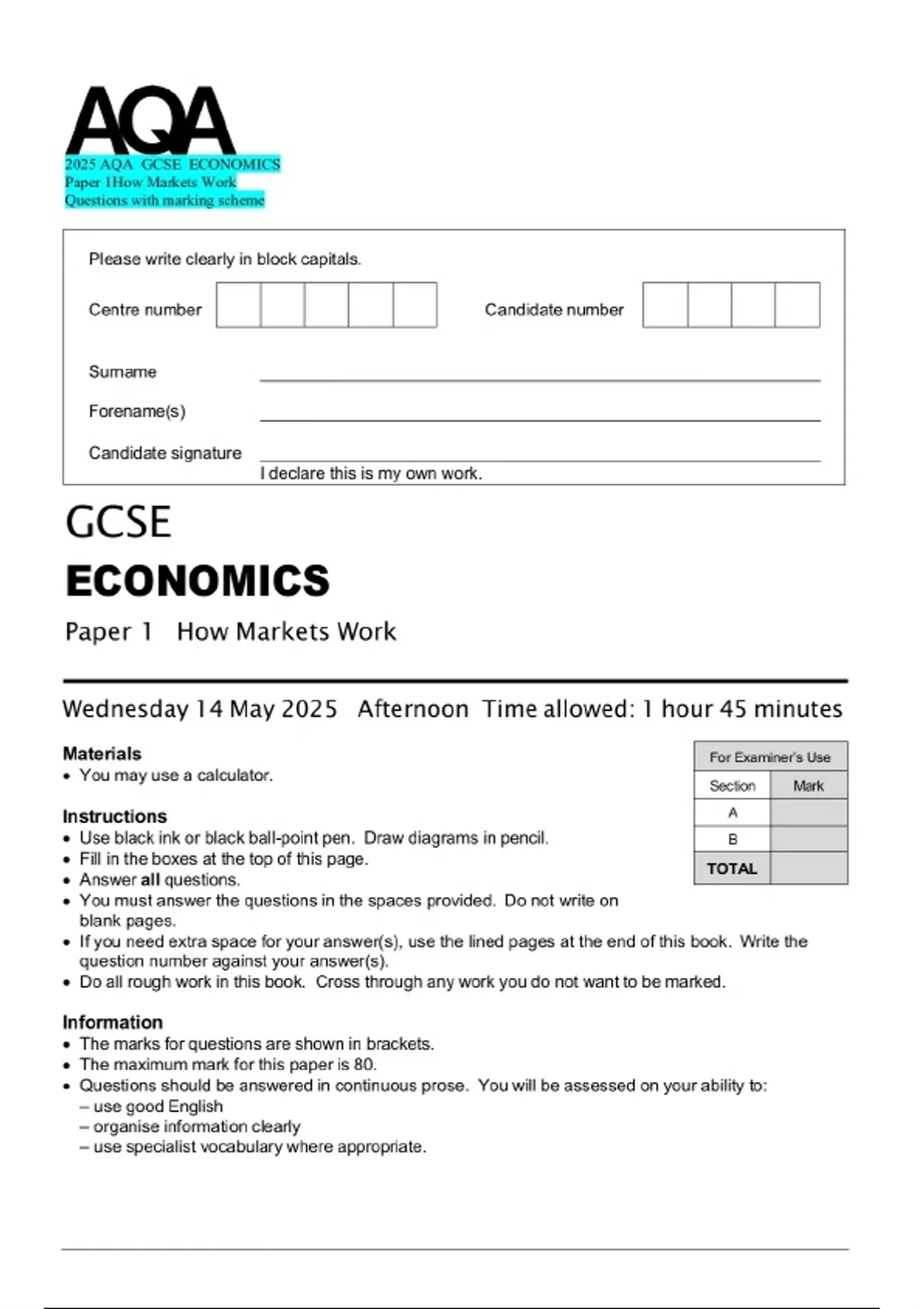 2025 AQA GCSE ECONOMICS Paper 1How Markets Work Exam booklet and evaluation scheme