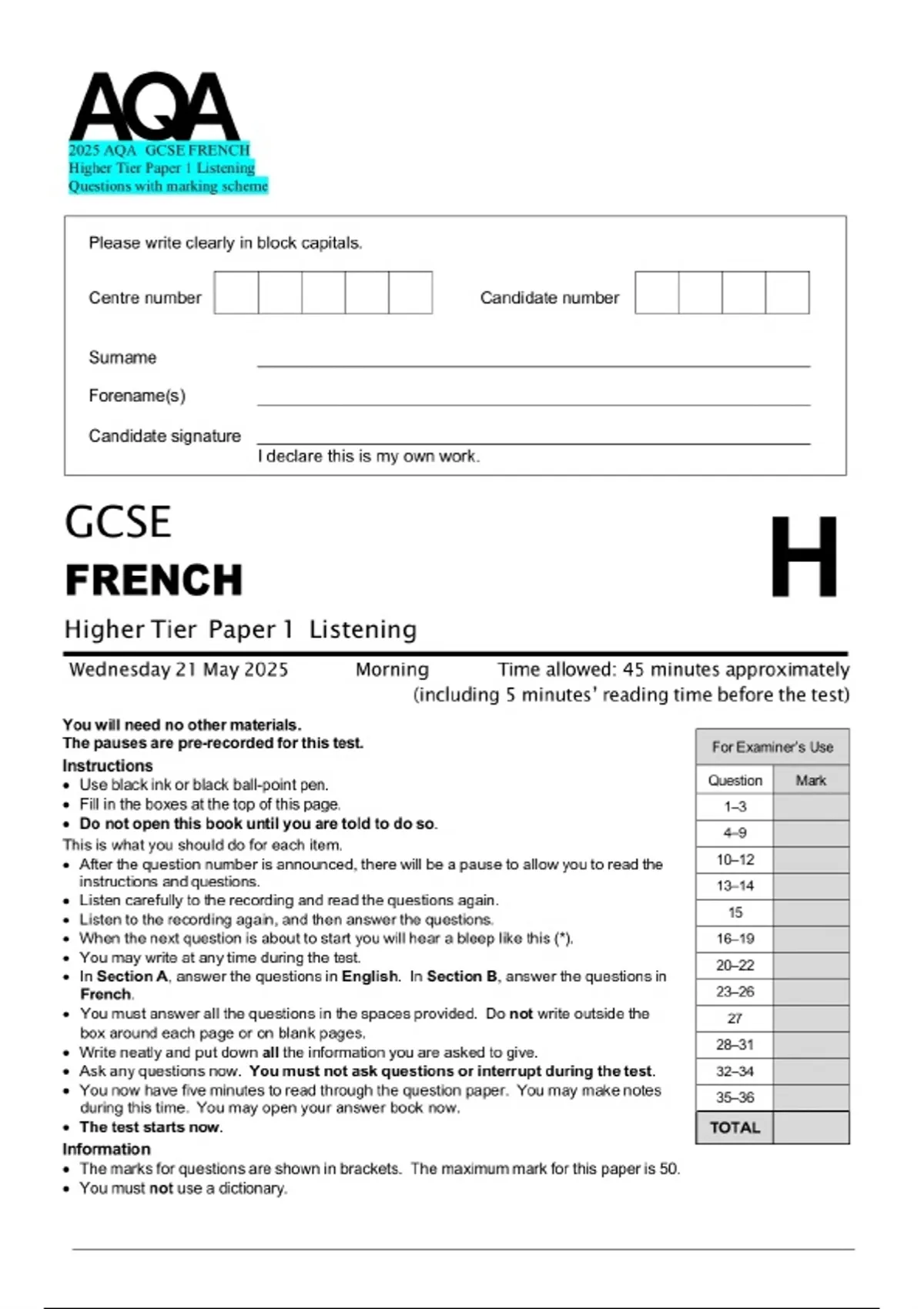 2025 AQA GCSE FRENCH Higher Tier Paper 1 Listening Exam booklet and evaluation scheme