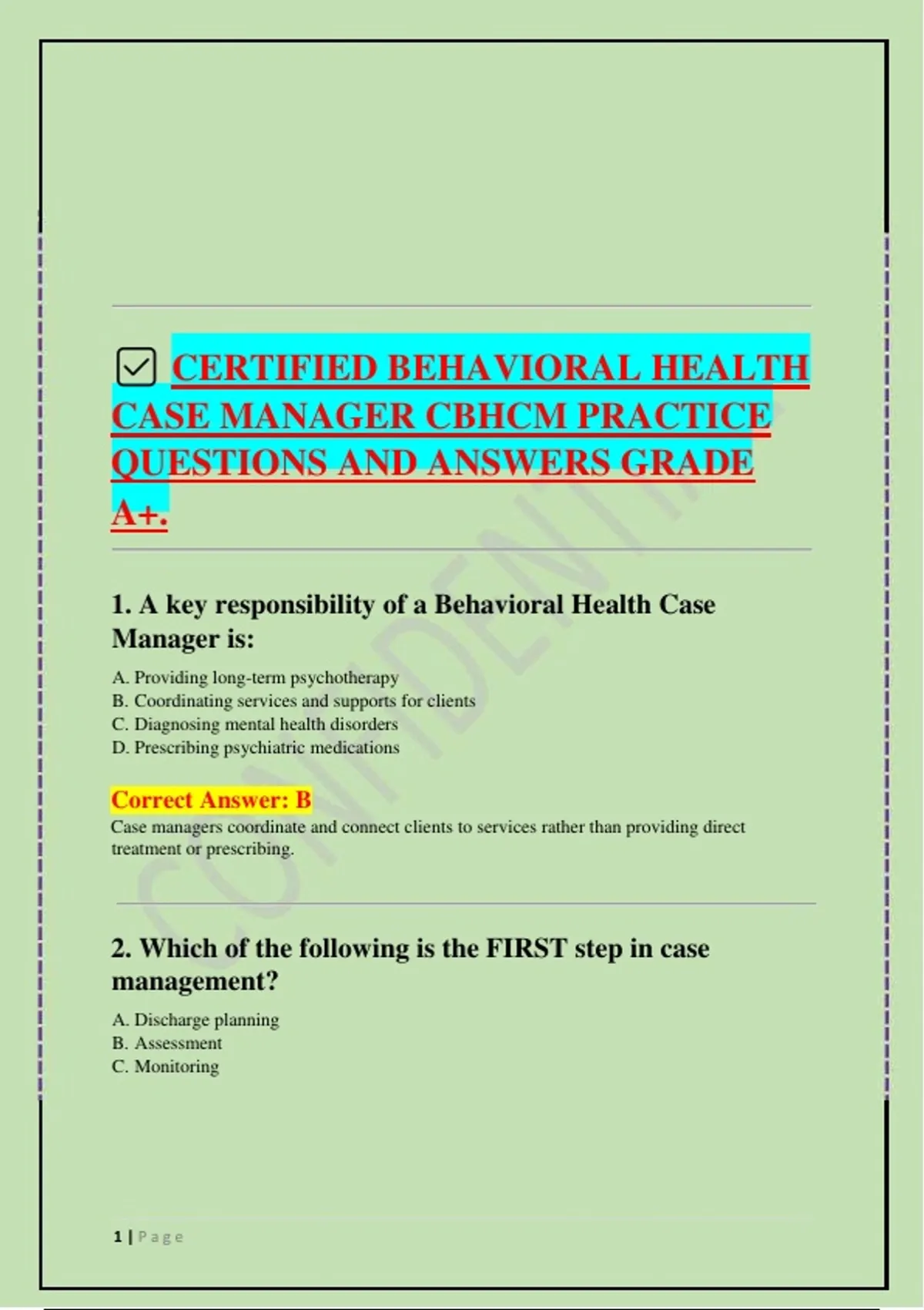Prepare for the Certified Behavioral Health Case Manager (CBHCM) exam with this comprehensive practice exam PDF featuring a full set of practice questions and verified answers. Covering essential behavioral health case management topics including client assessment, treatment planning, ethical standards, crisis intervention, and community resources, this guide is designed to help you strengthen your knowledge and excel on your certification exam. Ideal for candidates seeking to enhance their confidence and readiness for the CBHCM credential.