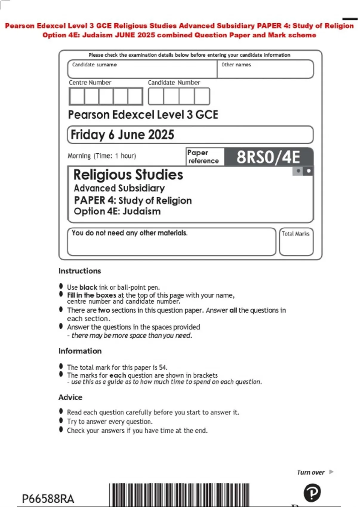 Pearson Edexcel Level 3 GCE Religious Studies Advanced Subsidiary PAPER 4: Study of Religion Option 4E: Judaism JUNE 2025 combined Question Paper and Mark scheme
