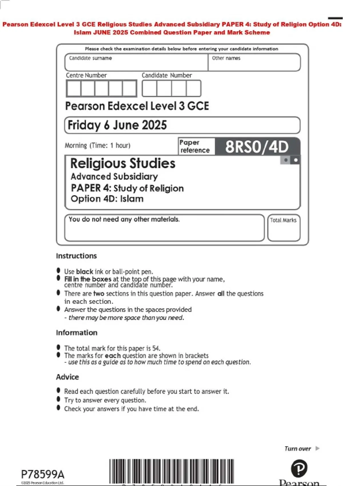 Pearson Edexcel Level 3 GCE Religious Studies Advanced Subsidiary PAPER 4: Study of Religion Option 4D: Islam JUNE 2025 Combined Question Paper and Mark Scheme