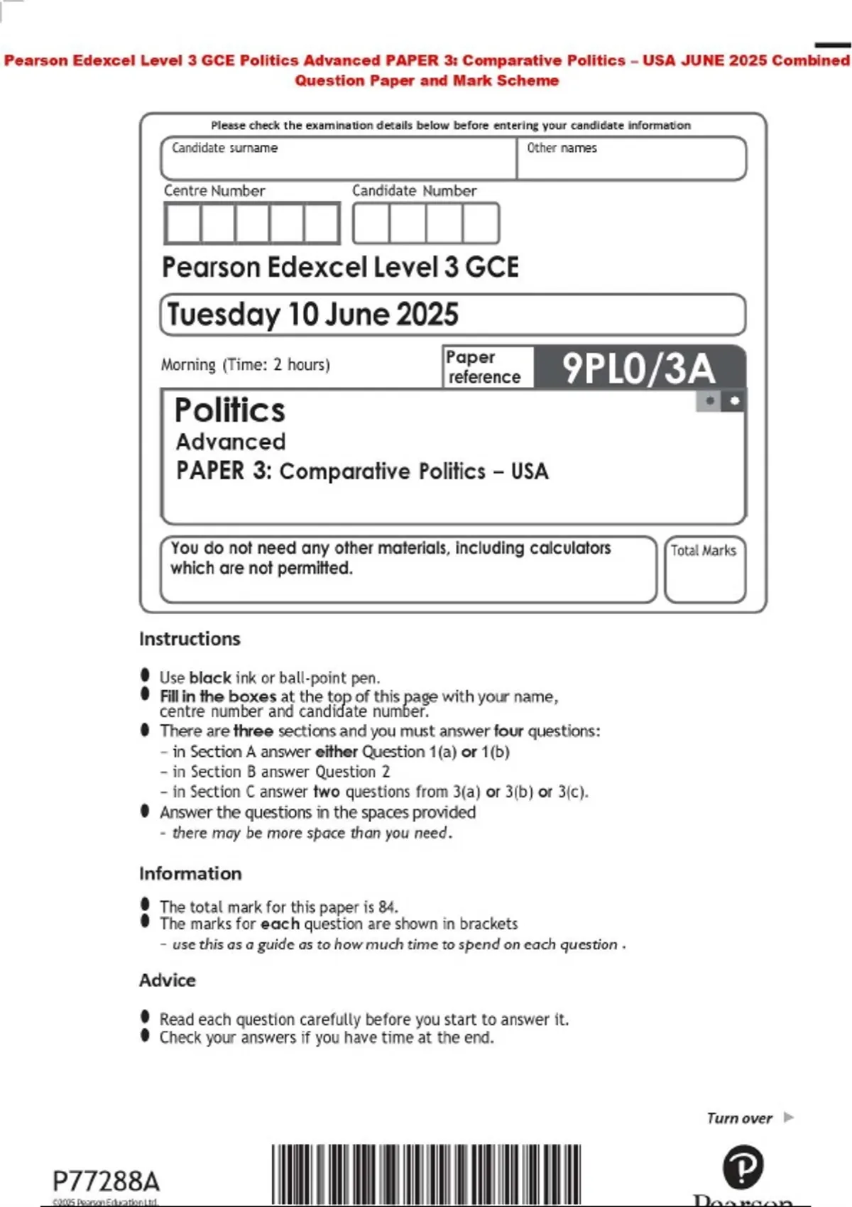 Pearson Edexcel Level 3 GCE Politics Advanced PAPER 3: Comparative Politics – USA JUNE 2025 Combined Question Paper and Mark Scheme