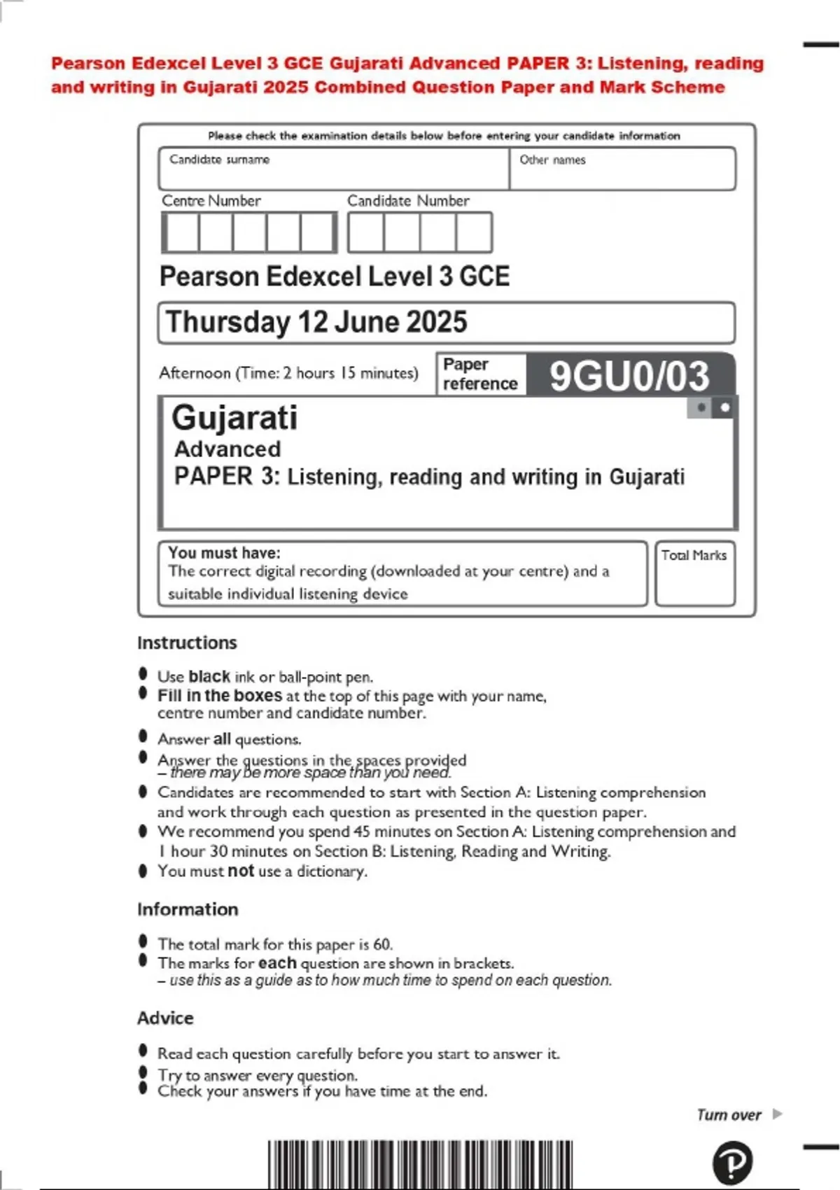 Pearson Edexcel Level 3 GCE Gujarati Advanced PAPER 3: Listening, reading and writing in Gujarati 2025 Combined Question Paper and Mark Scheme