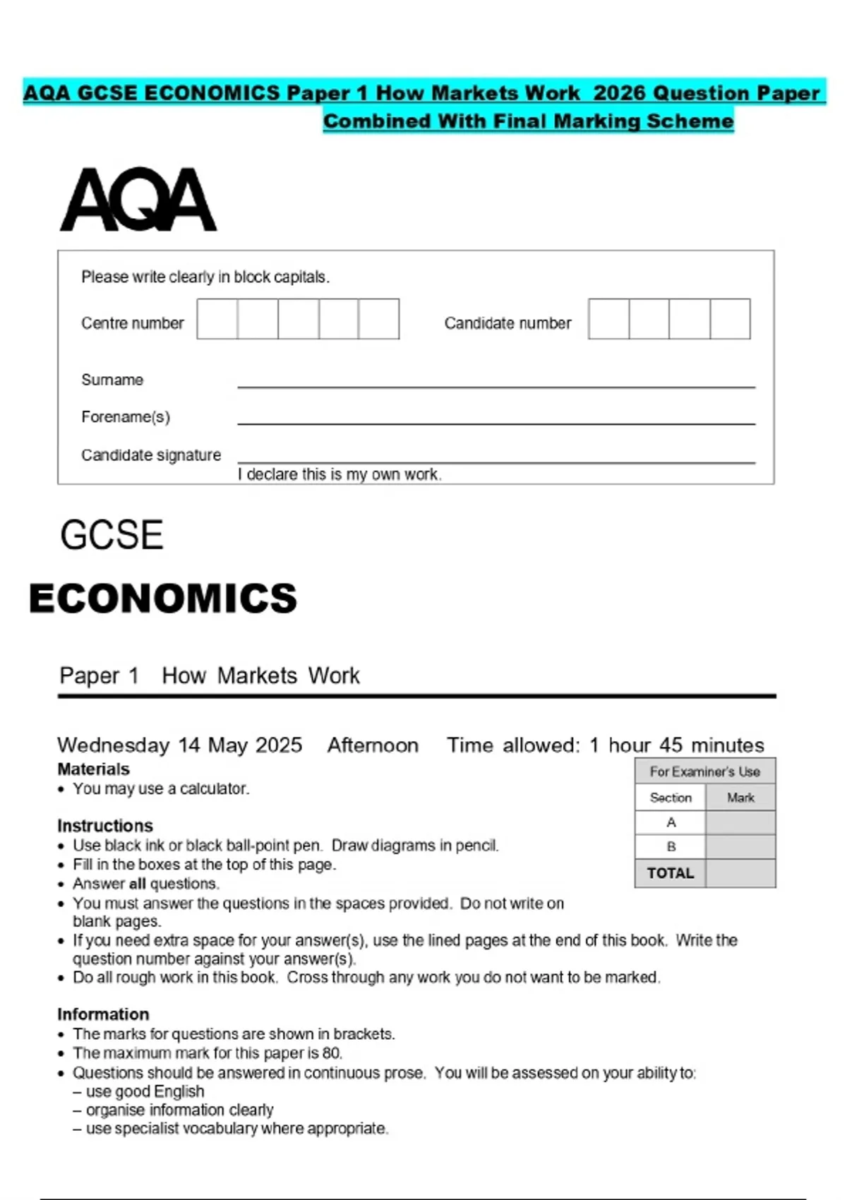 AQA GCSE ECONOMICS Paper 1 How Markets Work 2026 Question Paper Combined With Final Marking Scheme