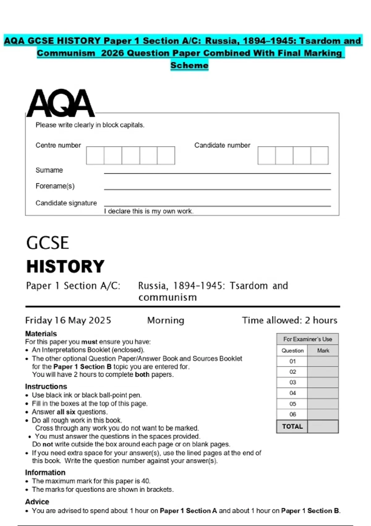 AQA GCSE HISTORY Paper 1 Section A/C: Russia, 1894–1945: Tsardom and Communism 2026 Question Paper Combined With Final Marking Scheme