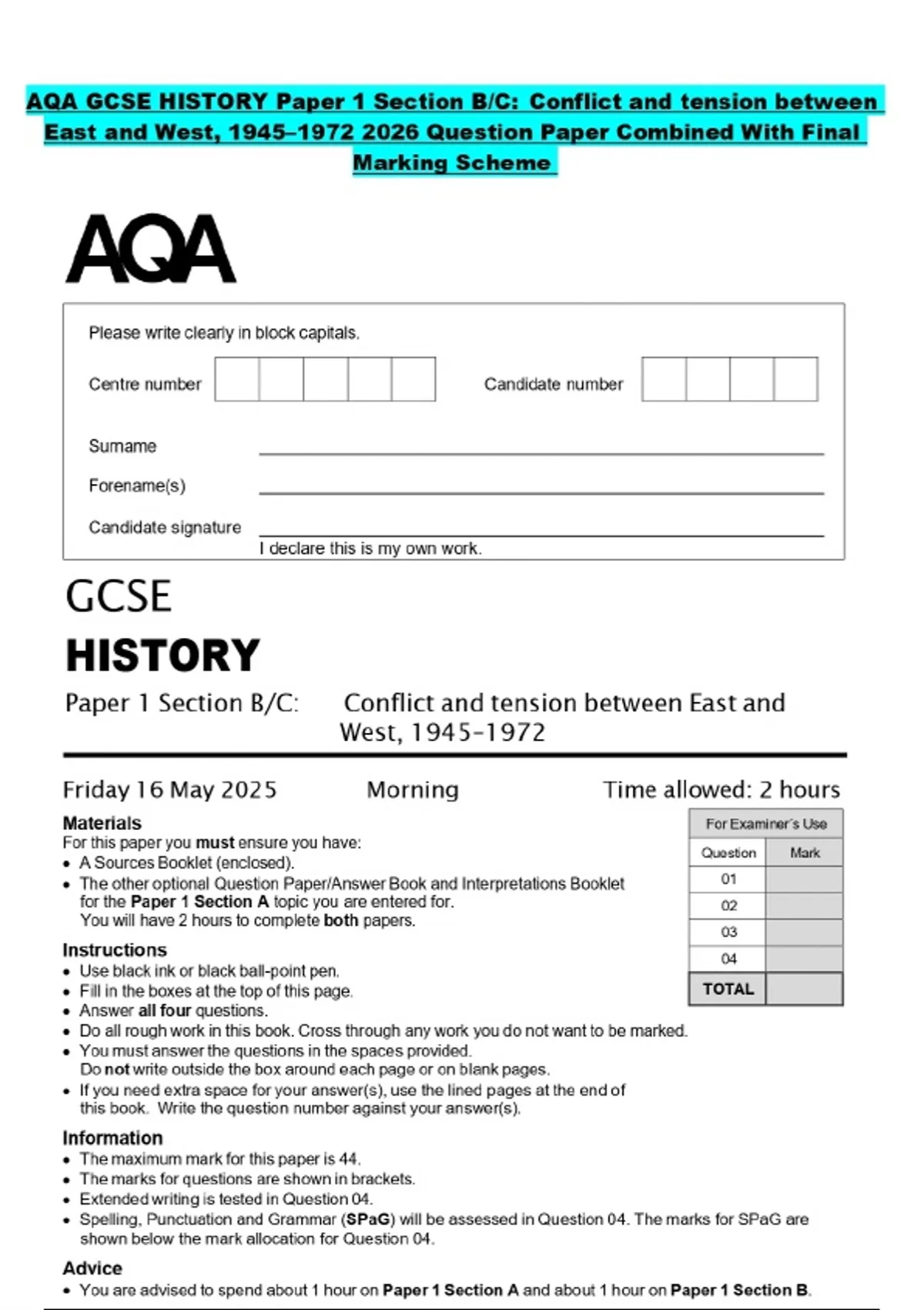 AQA GCSE HISTORY Paper 1 Section B/C: Conflict and tension between East and West, 1945– Question Paper Combined With Final Marking Scheme