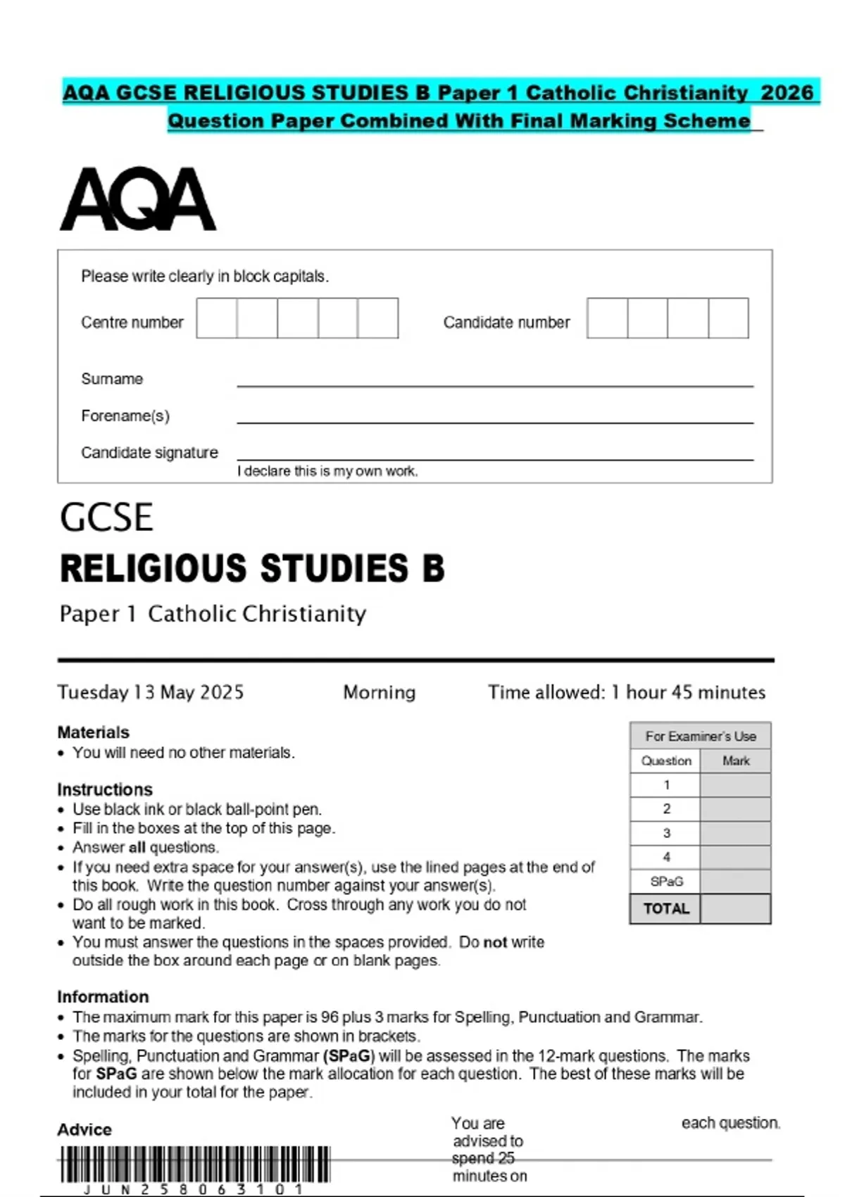 AQA GCSE RELIGIOUS STUDIES B Paper 1 Catholic Christianity 2026 Question Paper Combined With Final Marking Scheme