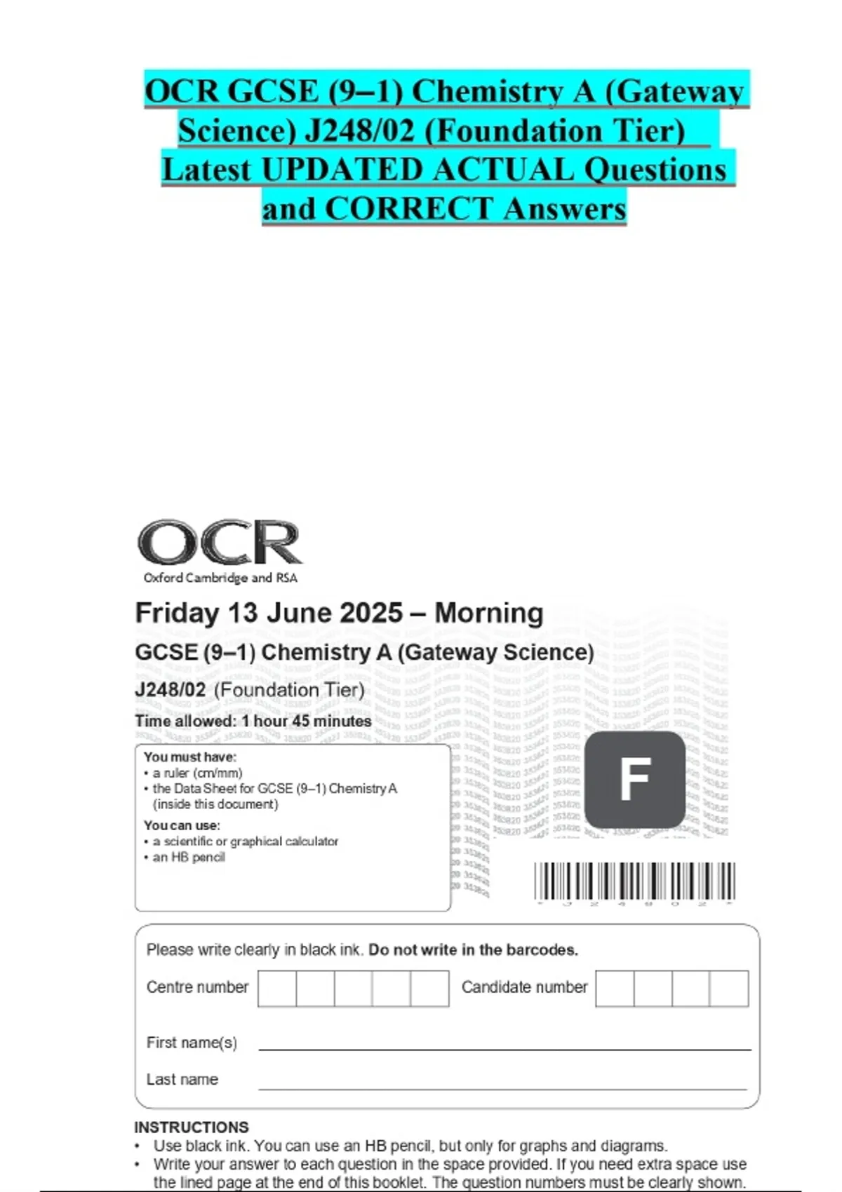 OCR GCSE (9–1) Chemistry A (Gateway Science) J248/02 (Foundation Tier) Latest UPDATED ACTUAL Questions and CORRECT Answers