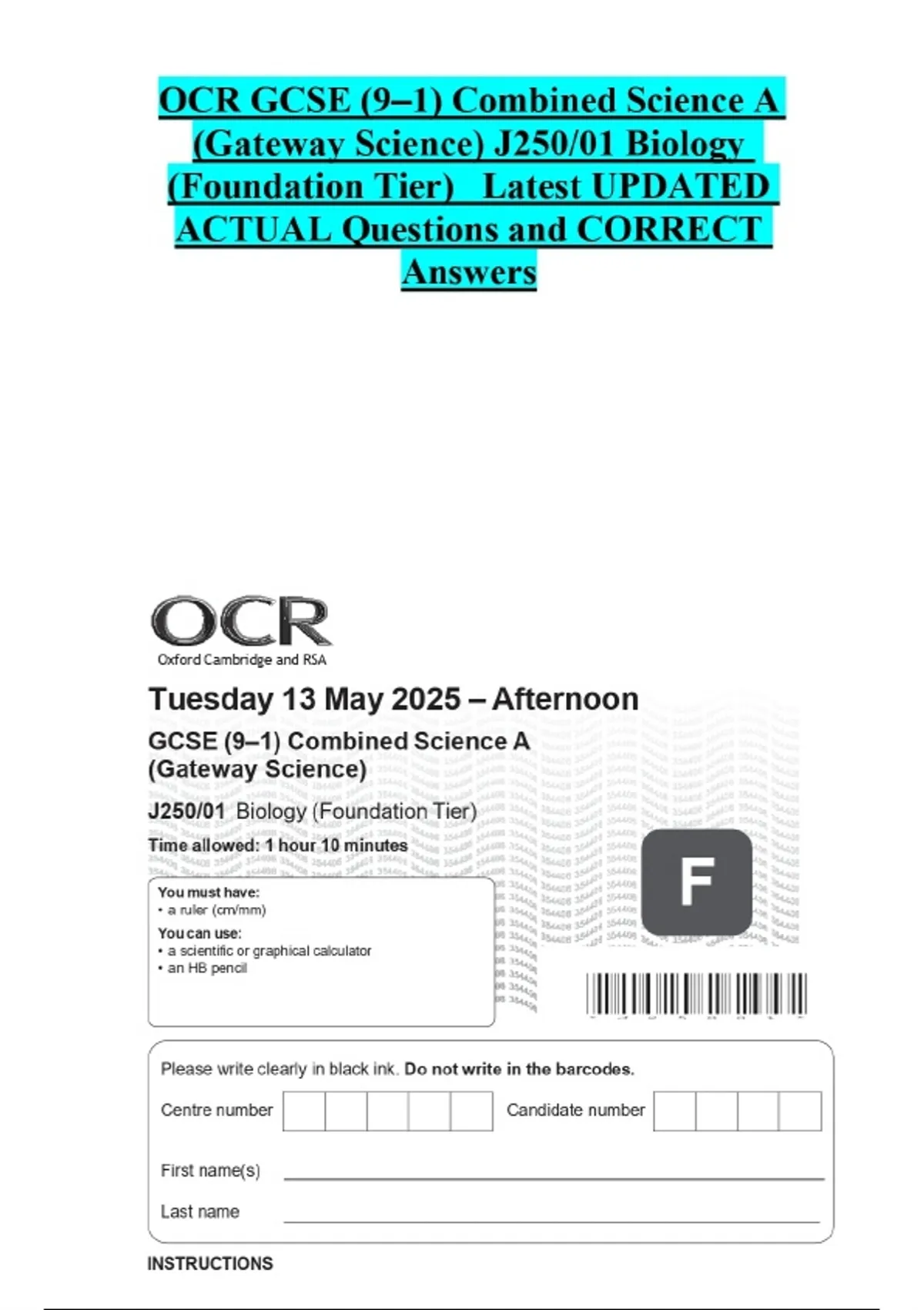OCR GCSE (9–1) Combined Science A (Gateway Science) J250/01 Biology (Foundation Tier) Latest UPDATED ACTUAL Questions and CORRECT Answers