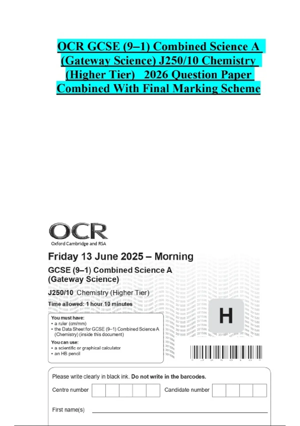 OCR GCSE (9–1) Combined Science A (Gateway Science) J250/10 Chemistry (Higher Tier) 2026 Question Paper Combined With Final Marking Scheme
