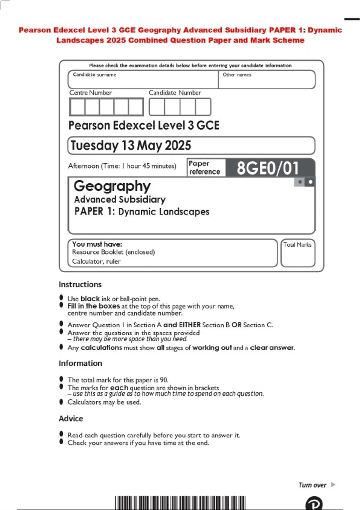 Pearson Edexcel Level 3 GCE Geography Advanced Subsidiary PAPER 1: Dynamic Landscapes 2025 Combined Question Paper and Mark Scheme