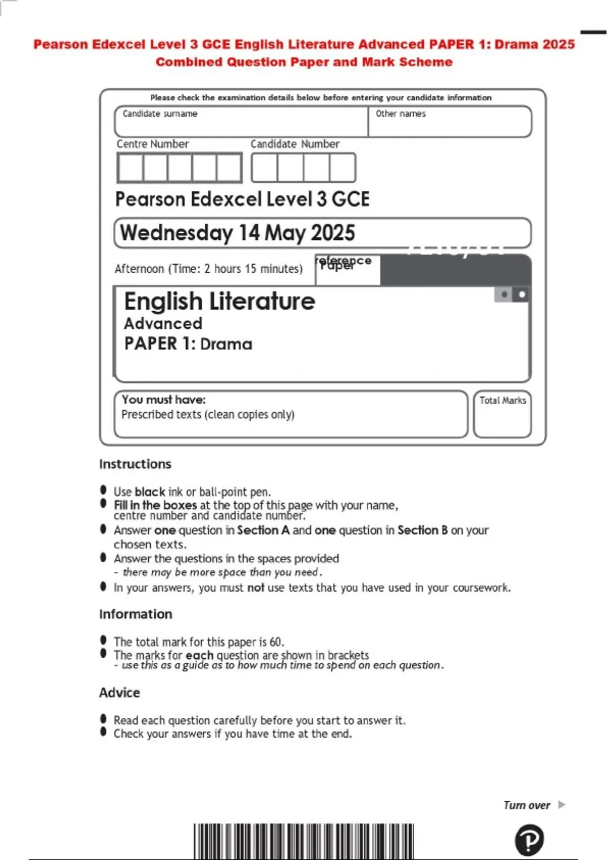 Pearson Edexcel Level 3 GCE English Literature Advanced PAPER 1: Drama 2025 Combined Question Paper and Mark Scheme