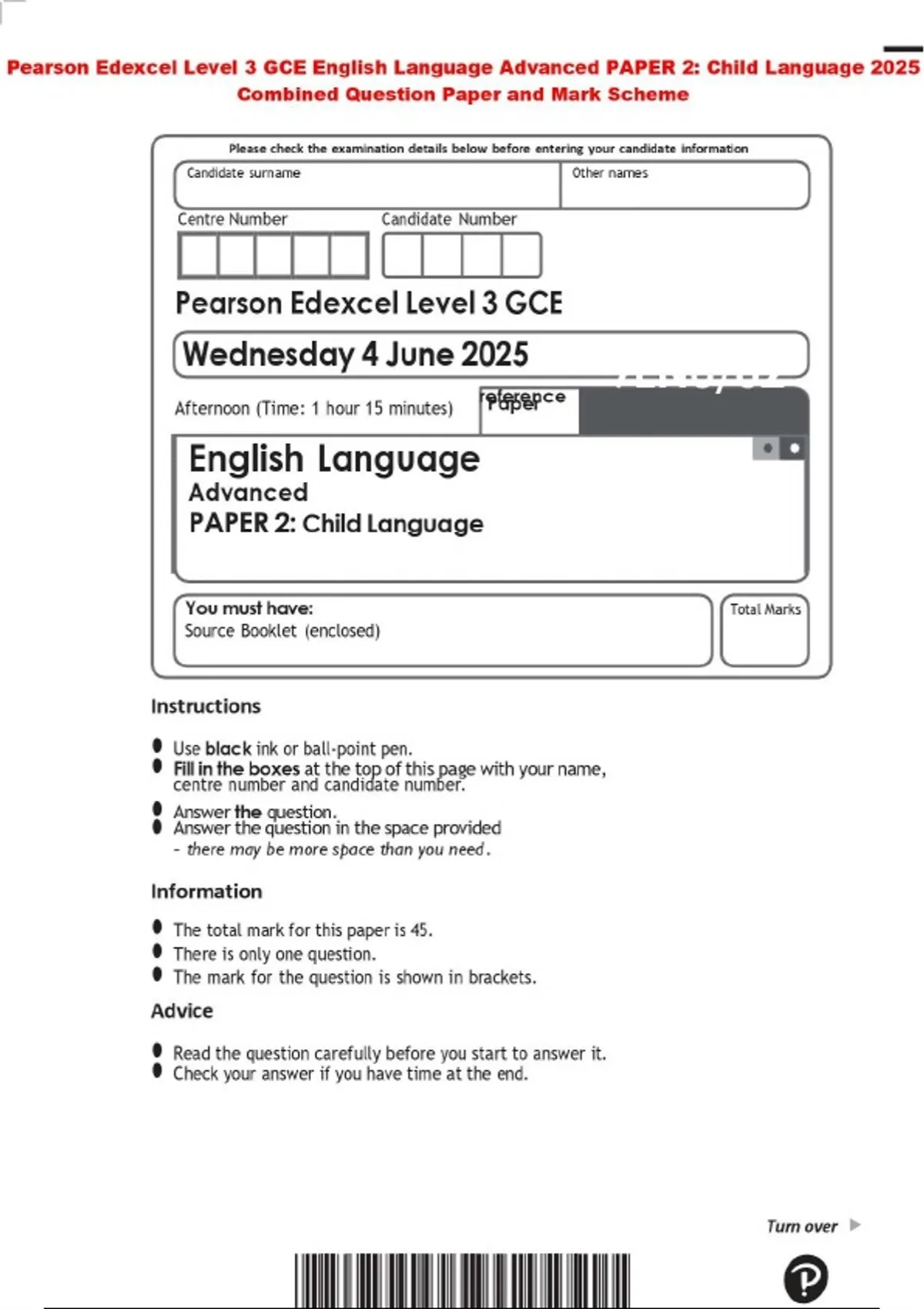 Pearson Edexcel Level 3 GCE English Language Advanced PAPER 2: Child Language 2025 Combined Question Paper and Mark Scheme