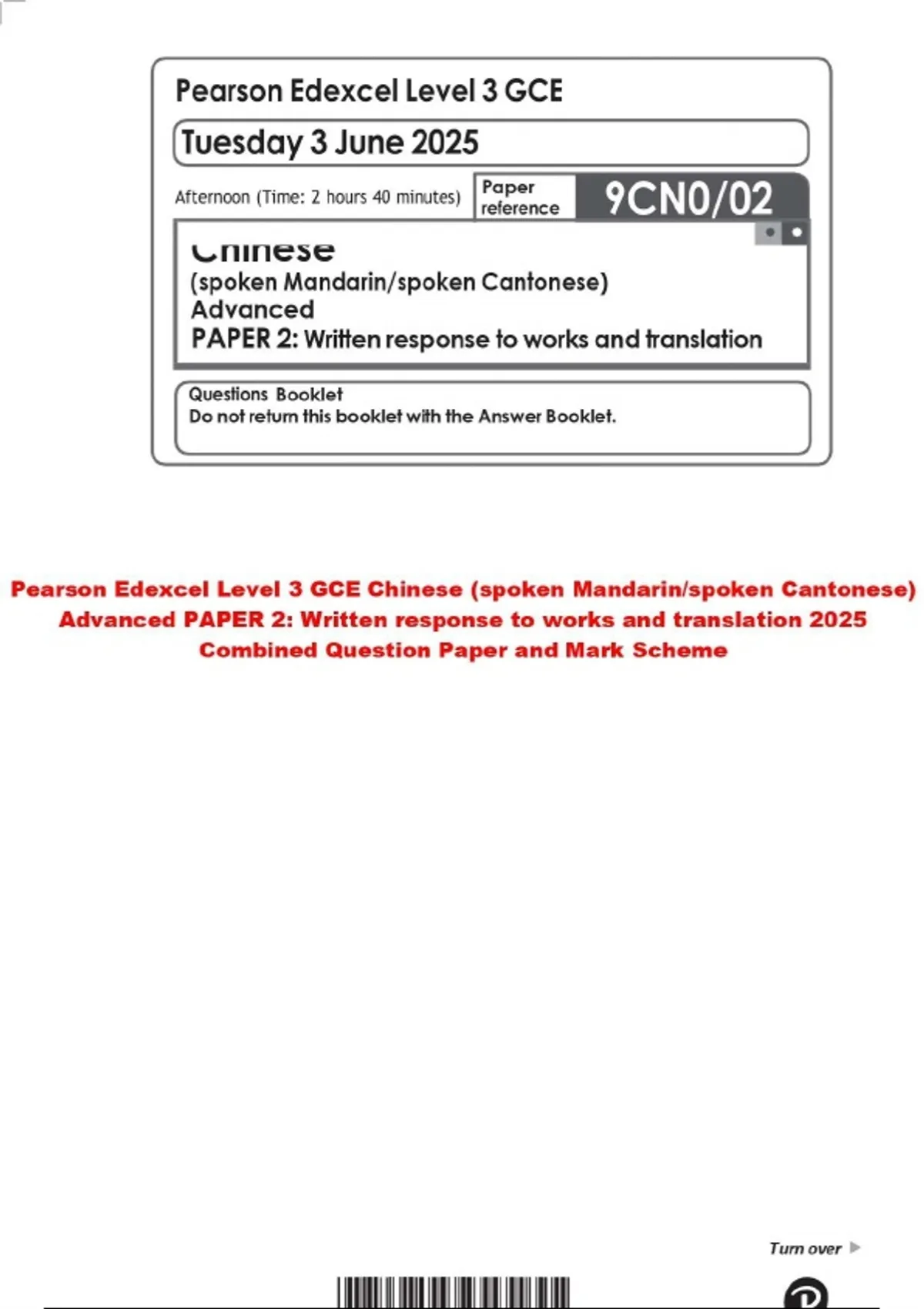 Pearson Edexcel Level 3 GCE Chinese (spoken Mandarin/spoken Cantonese) Advanced PAPER 2: Written response to works and translation 2025 Combined Question Paper and Mark Scheme