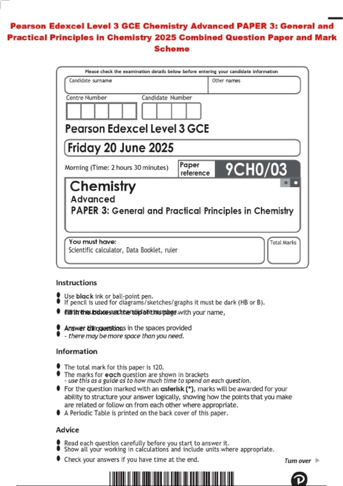 Pearson Edexcel Level 3 GCE Chemistry Advanced PAPER 3: General and Practical Principles in Chemistry 2025 Combined Question Paper and Mark Scheme