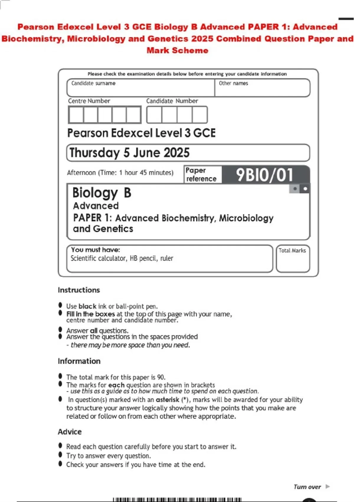 Pearson Edexcel Level 3 GCE Biology B Advanced PAPER 1: Advanced Biochemistry, Microbiology and Genetics 2025 Combined Question Paper and Mark Scheme