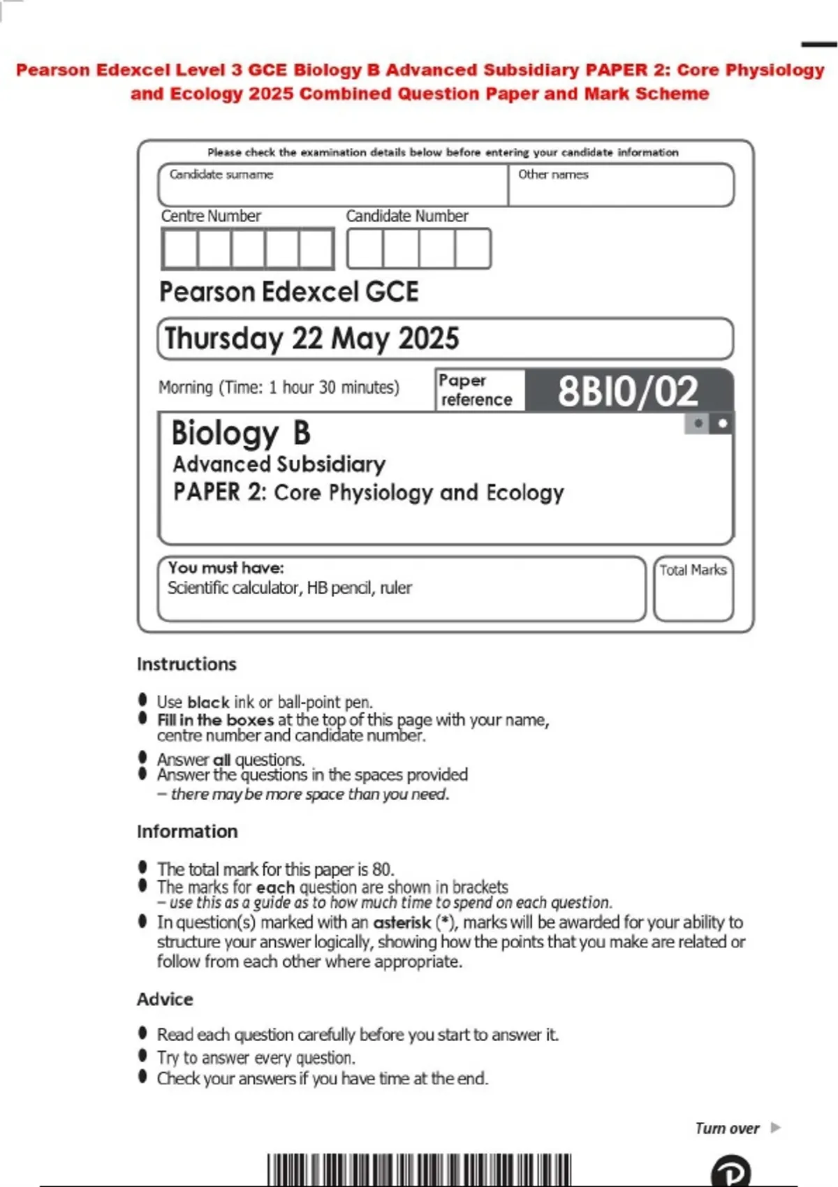 Pearson Edexcel Level 3 GCE Biology B Advanced Subsidiary PAPER 2: Core Physiology and Ecology 2025 Combined Question Paper and Mark Scheme