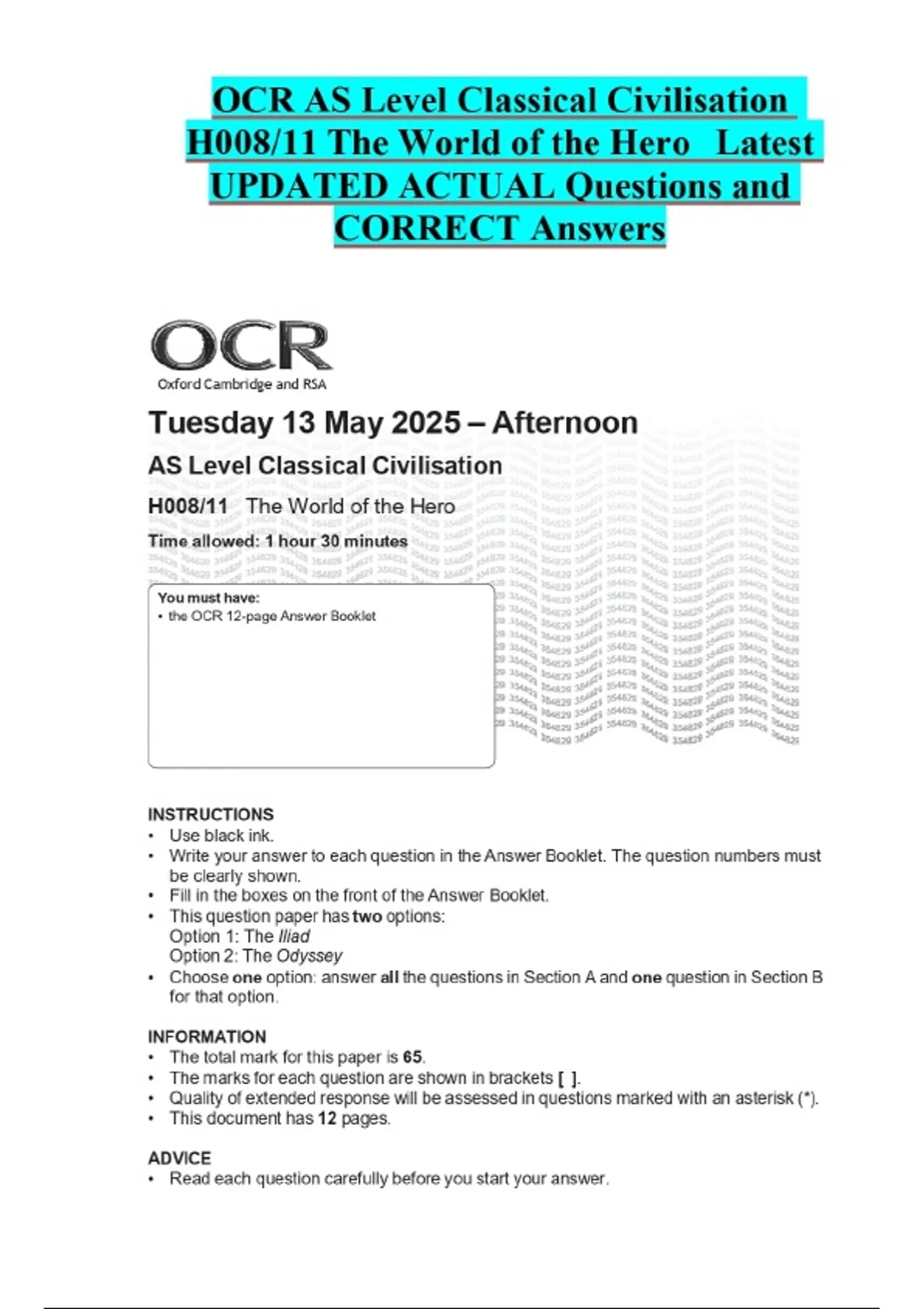 OCR AS Level Classical Civilisation H008/11 The World of the Hero Latest UPDATED ACTUAL Questions and CORRECT Answers