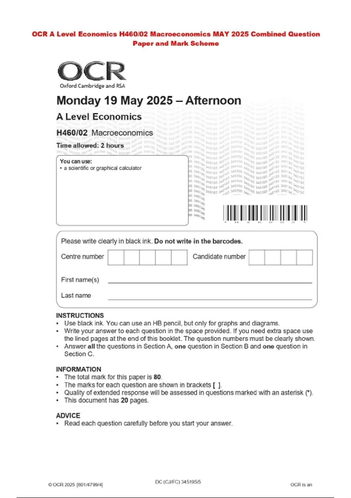 OCR A Level Economics H460/02 Macroeconomics MAY 2025 Combined Question Paper and Mark Scheme