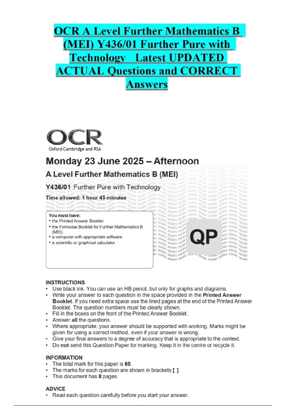 OCR A Level Further Mathematics B (MEI) Y436/01 Further Pure with Technology Latest UPDATED ACTUAL Questions and CORRECT Answers
