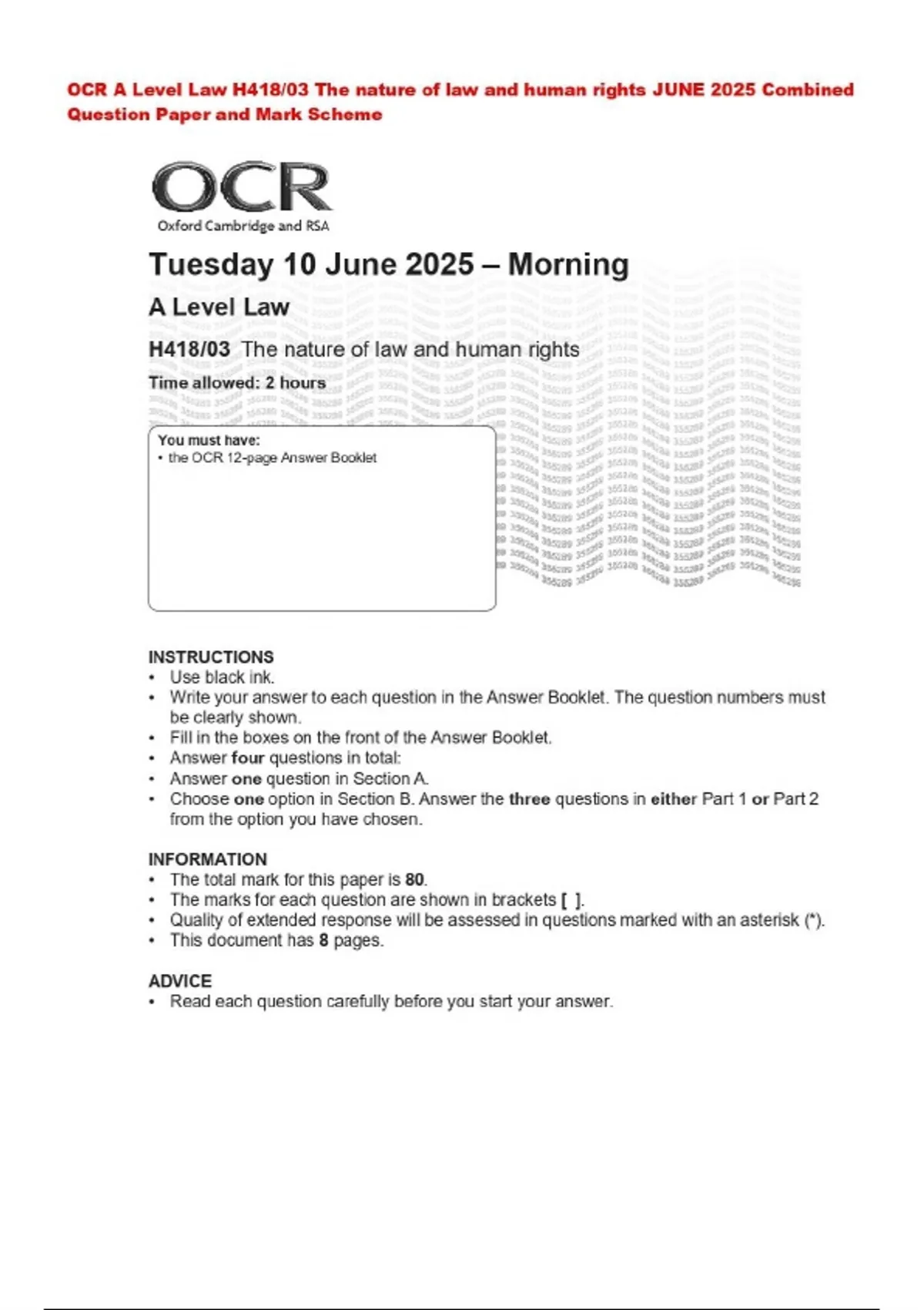 OCR A Level Law H418/03 The nature of law and human rights JUNE 2025 Combined Question Paper and Mark Scheme