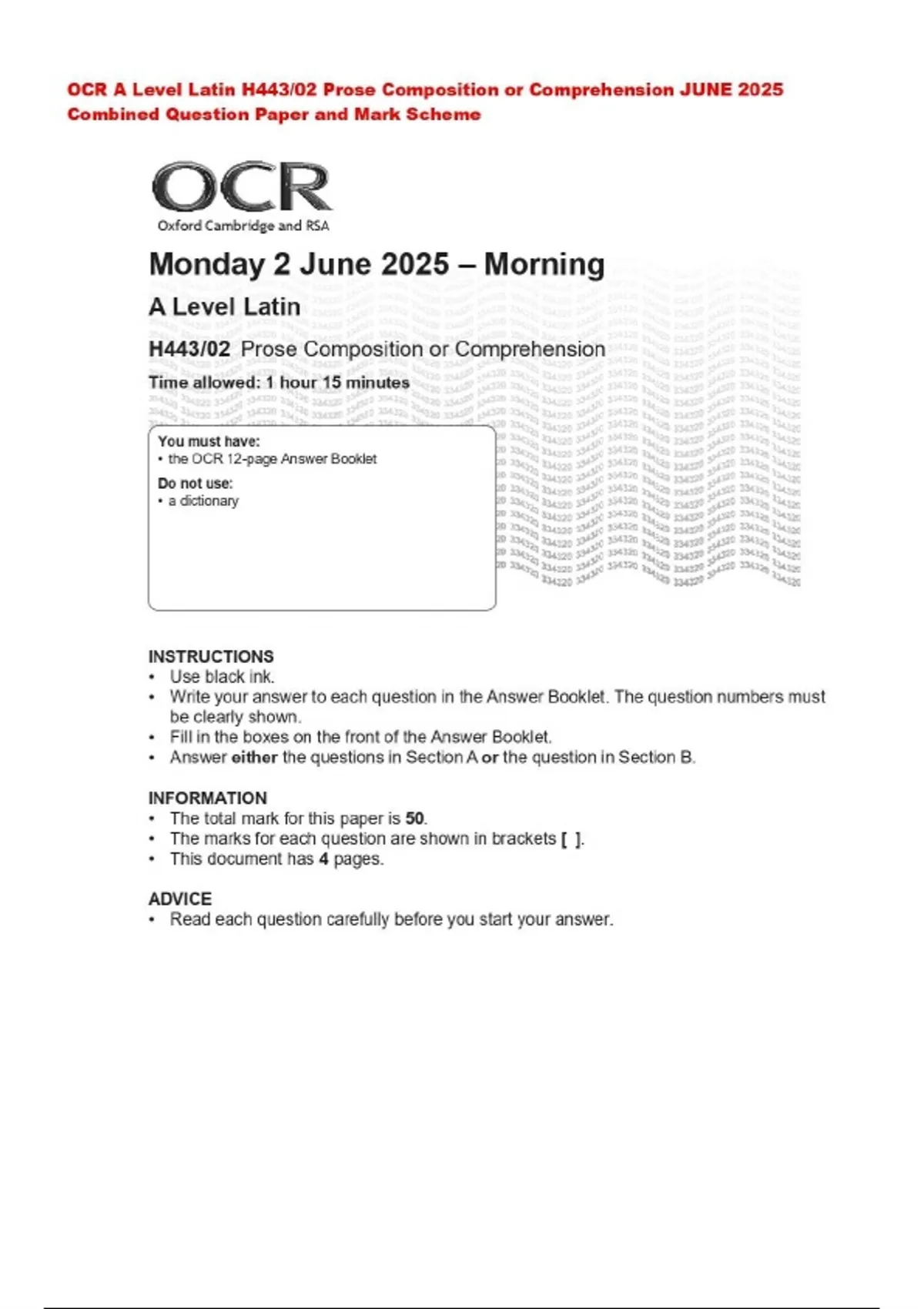OCR A Level Latin H443/02 Prose Composition or Comprehension JUNE 2025 Combined Question Paper and Mark Scheme