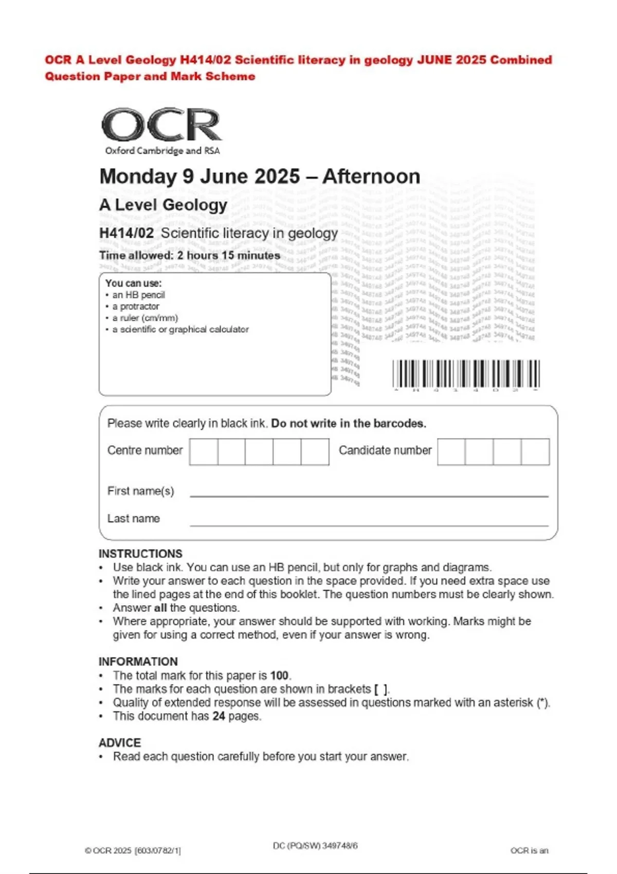 OCR A Level Geology H414/02 Scientific literacy in geology JUNE 2025 Combined Question Paper and Mark Scheme