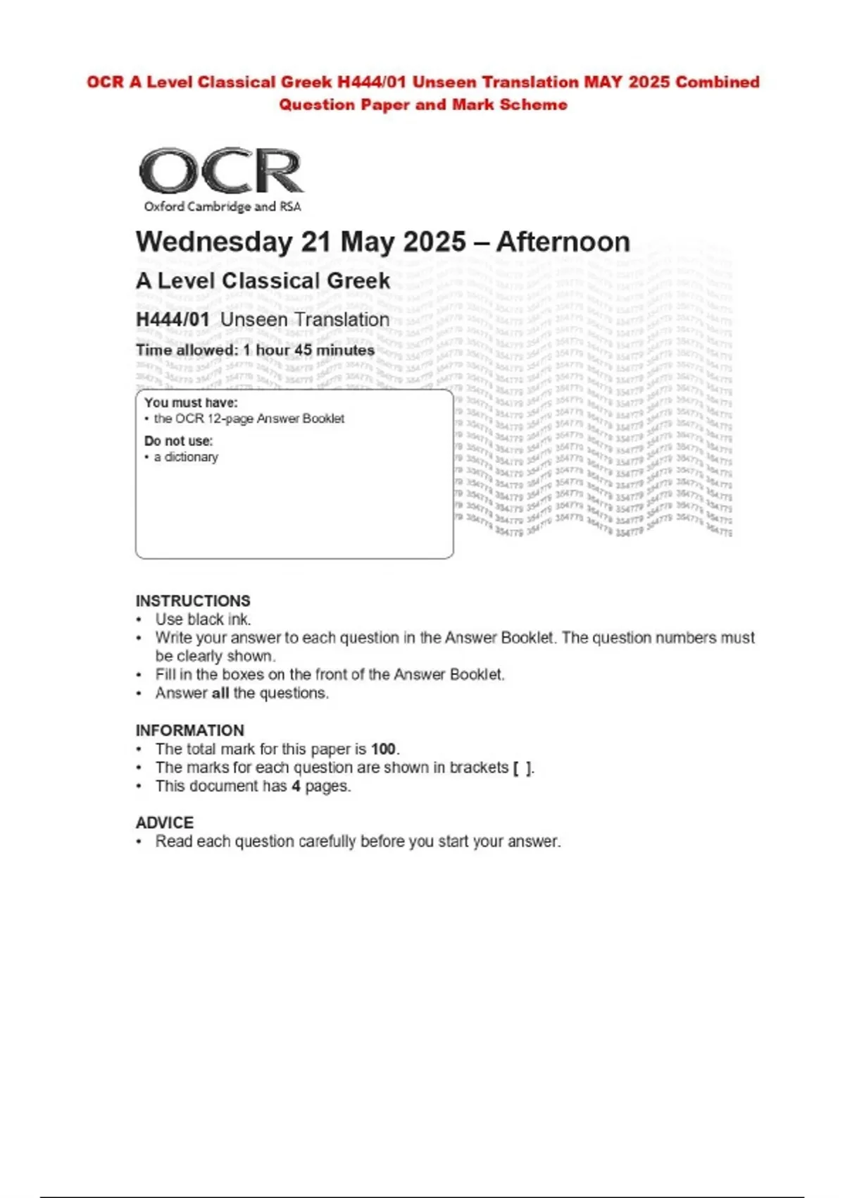 OCR A Level Classical Greek H444/01 Unseen Translation MAY 2025 Combined Question Paper and Mark Scheme
