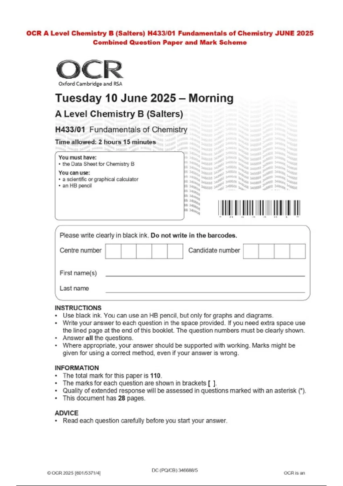 OCR A Level Chemistry B (Salters) H433/01 Fundamentals of Chemistry JUNE 2025 Combined Question Paper and Mark Scheme