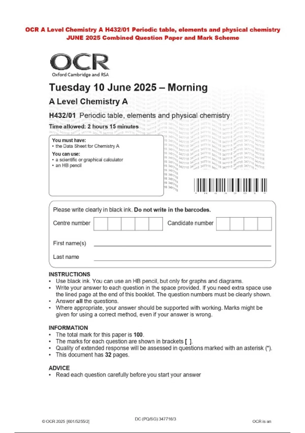OCR A Level Chemistry A H432/01 Periodic table, elements and physical chemistry JUNE 2025 Combined Question Paper and Mark Scheme