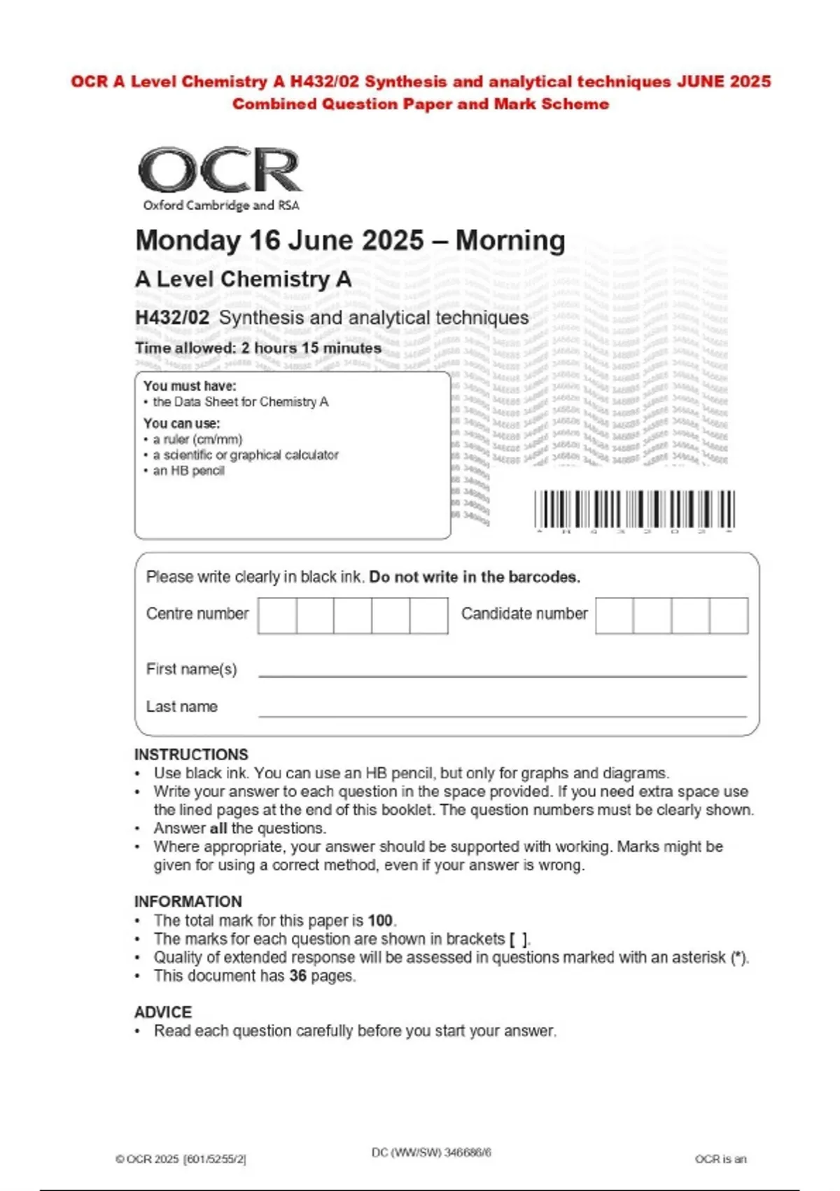 OCR A Level Chemistry A H432/02 Synthesis and analytical techniques JUNE 2025 Combined Question Paper and Mark Scheme