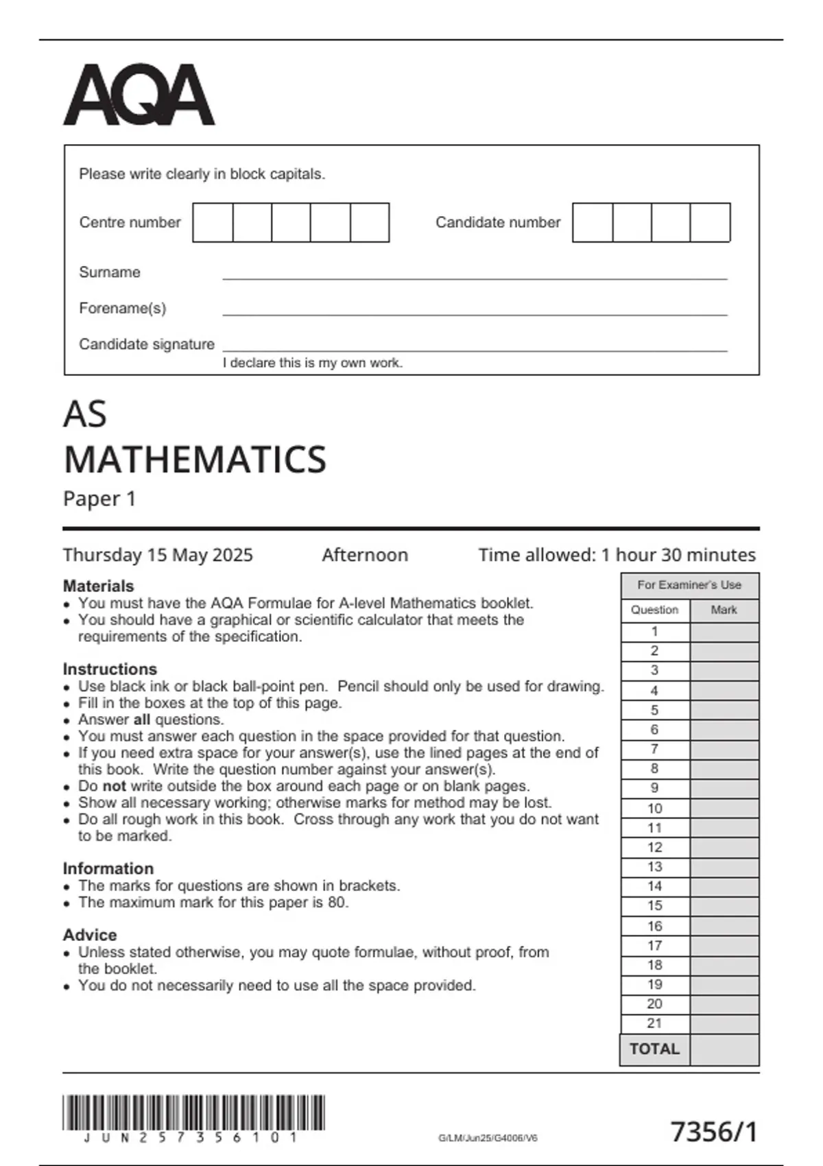 AQA AS LEVEL 2025 MATHS 7356 PAPER 1 QP