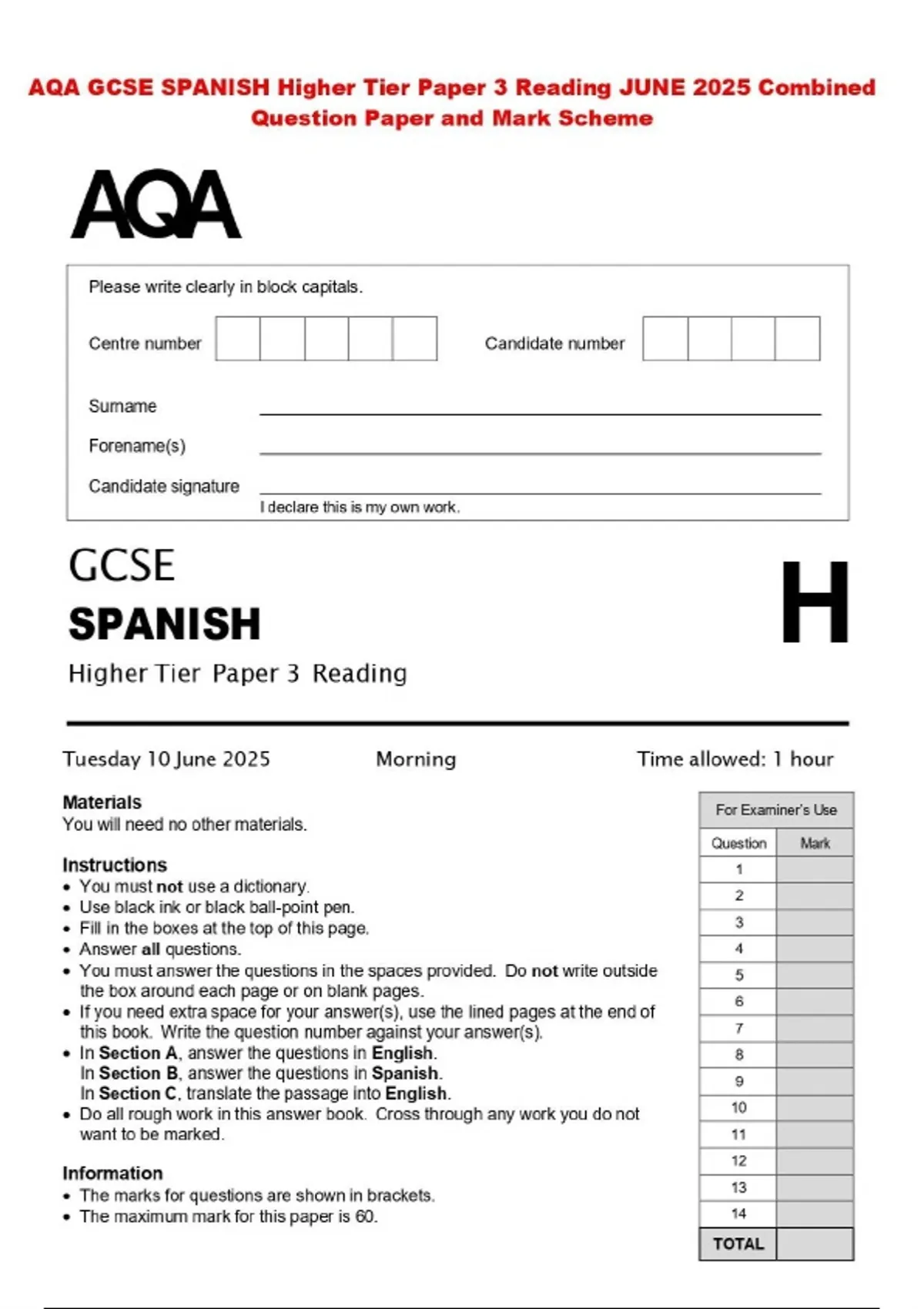 AQA GCSE SPANISH Higher Tier Paper 3 Reading JUNE 2025 Combined Question Paper and Mark Scheme