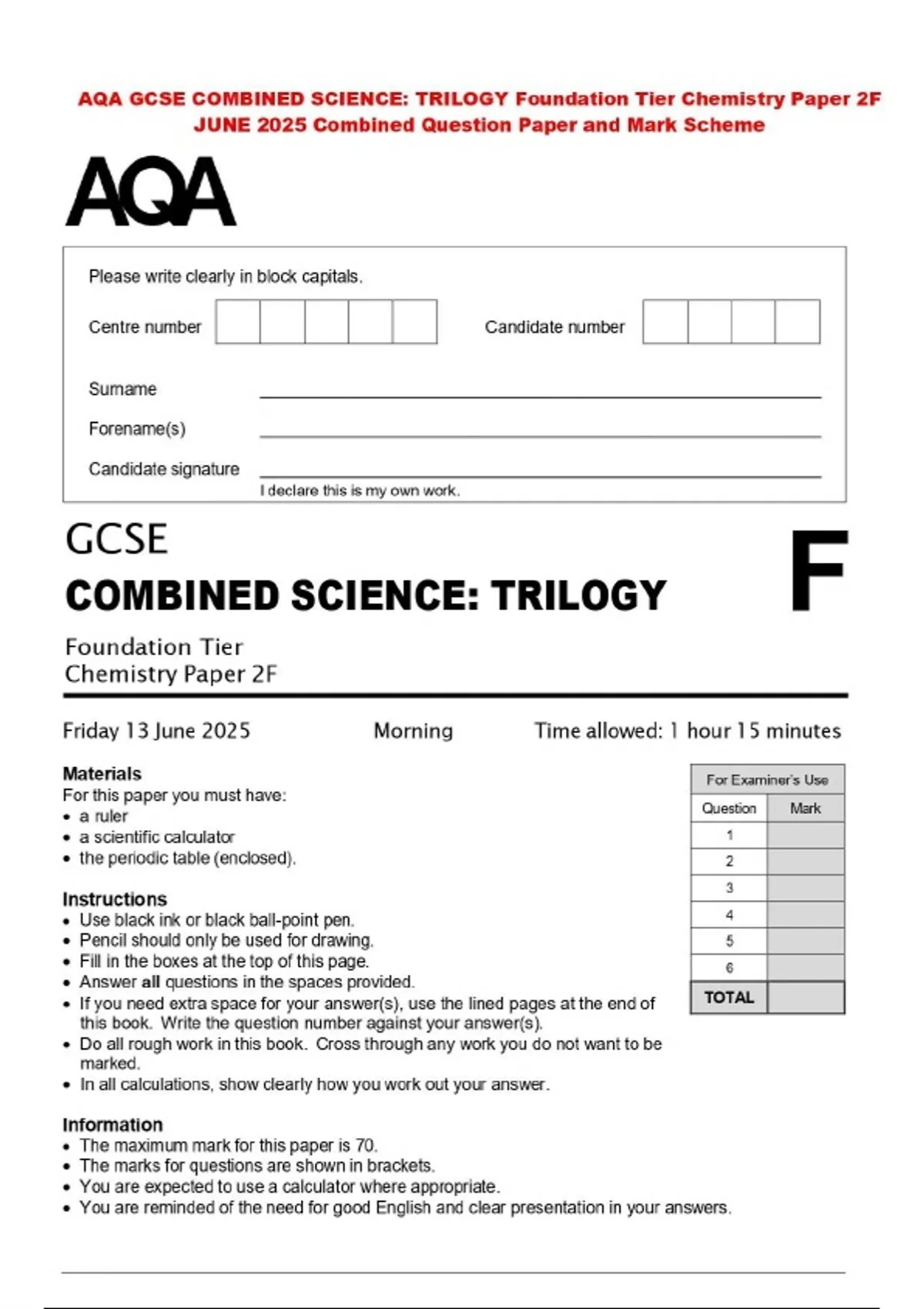 AQA GCSE COMBINED SCIENCE: TRILOGY Foundation Tier Chemistry Paper 2F JUNE 2025 Combined Question Paper and Mark Scheme