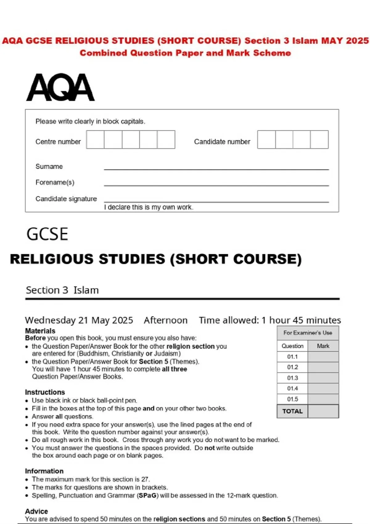 AQA GCSE RELIGIOUS STUDIES (SHORT COURSE) Section 3 Islam MAY 2025 Combined Question Paper and Mark Scheme