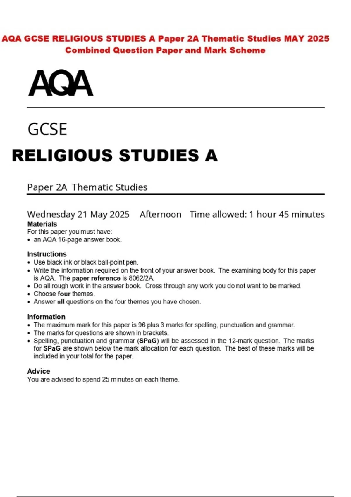 AQA GCSE RELIGIOUS STUDIES A Paper 2A Thematic Studies MAY 2025 Combined Question Paper and Mark Scheme