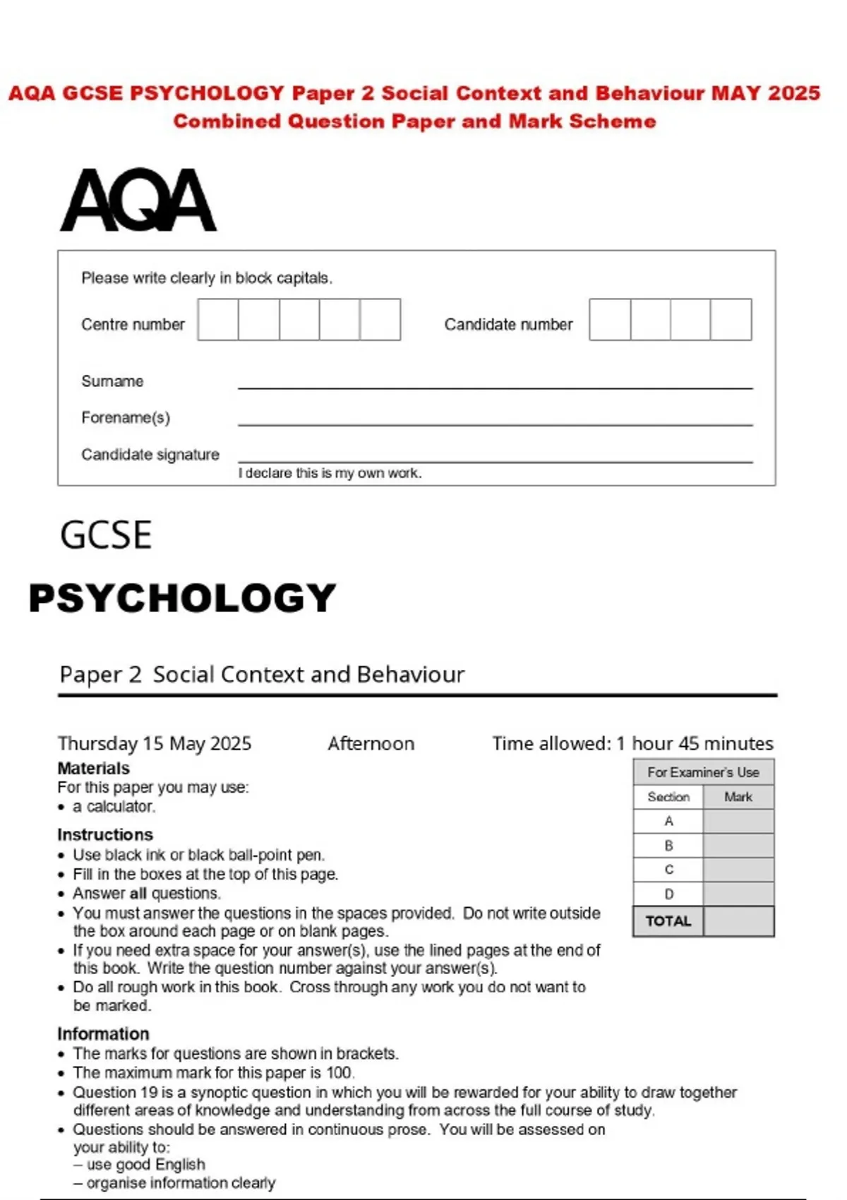 AQA GCSE PSYCHOLOGY Paper 2 Social Context and Behaviour MAY 2025 Combined Question Paper and Mark Scheme